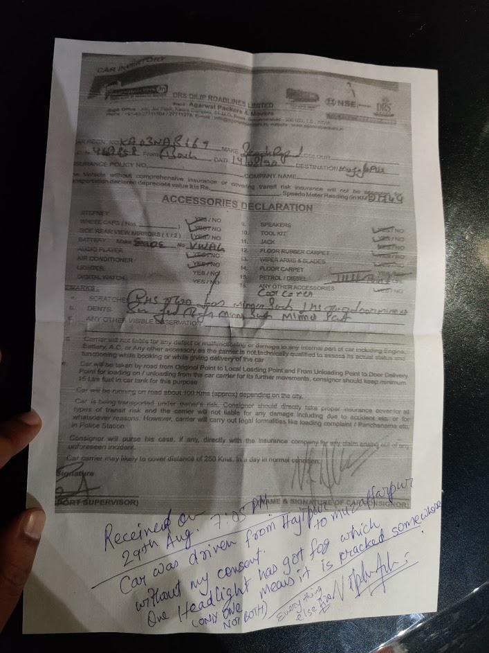 Delivery Agent: " Sir I am already coming by driving since the car was in a container only till Patna"(Now I don't know why I was not told about it. Why I was charged till Muzaffarpur when they were using my petrol to deliver to Muzaffarpur.)