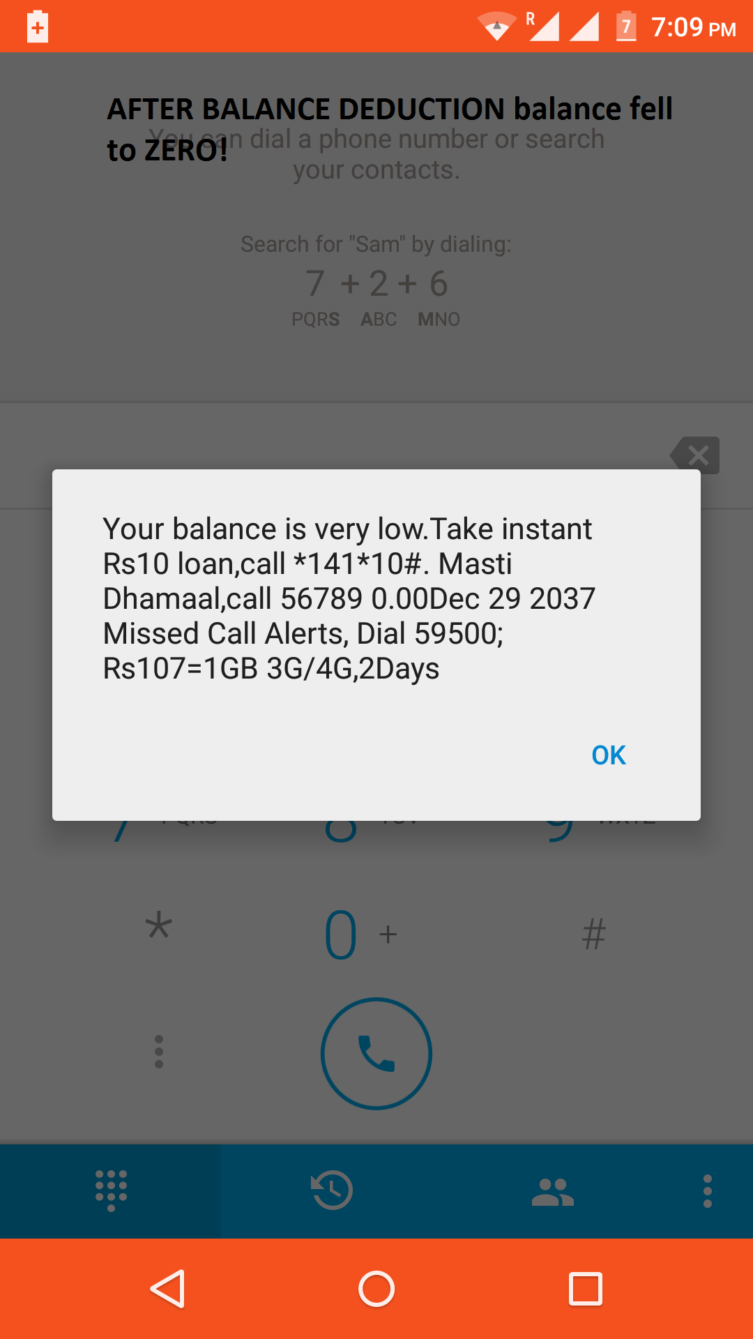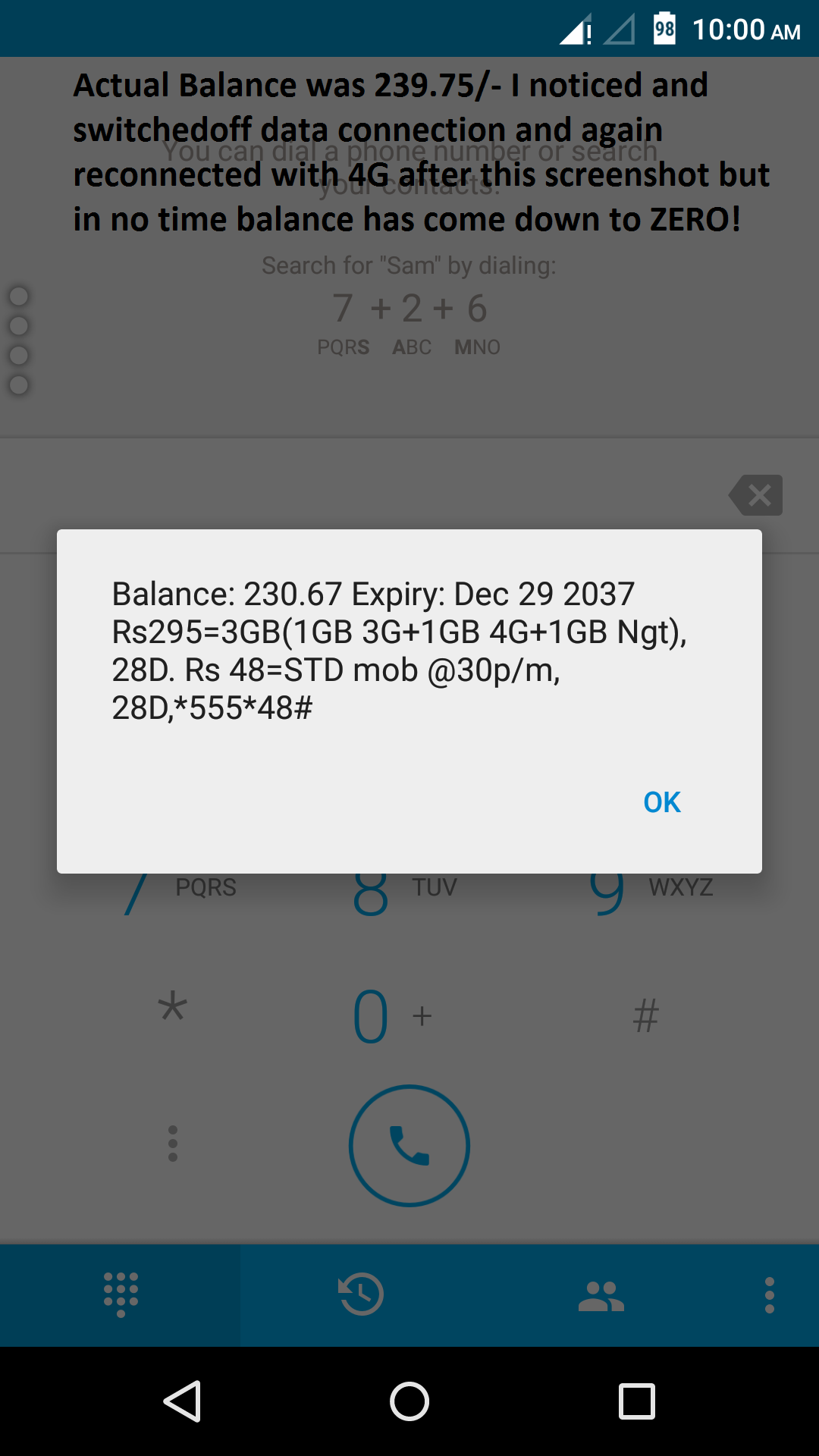 Had a balance of?239.75/- as on 2nd of Aug 2016 9:30Am but my balance fell to ZERO by 1:30Pm and had no balance to call near and dear from hospital. A message appeared soon after balance fell to ZERO which said recharge to get uninterrupted connectivity or request for a loan!