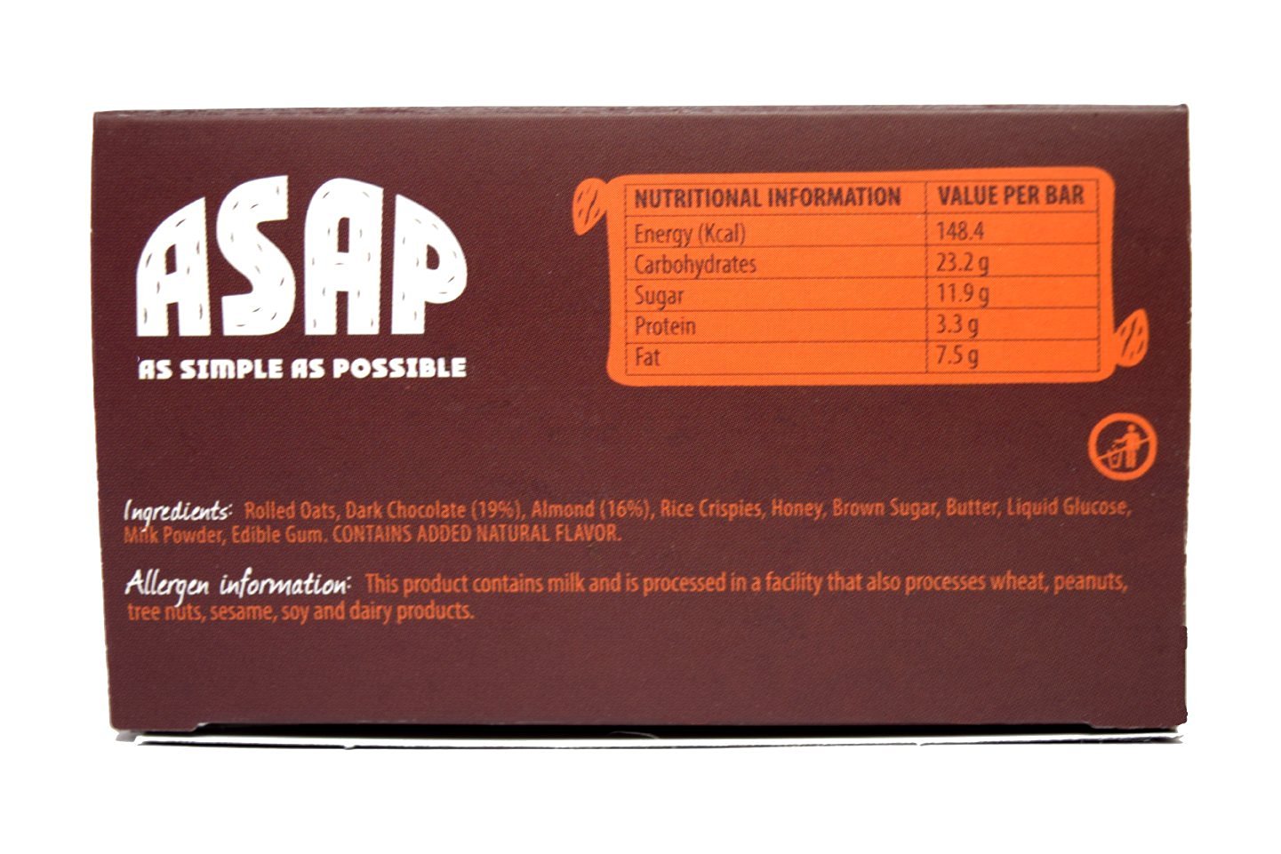 I was remined of ASAP snack bar that I bought off amazon India, that everyone at home relished . It has a thick layer of dark chocolate covered with rolled oats and rice crispies to pack in a lot of fiber / carbohydrates and protien .along with nuts ie almonds to further enhance the flavour, nuttiness and nutrition of the snack bar.