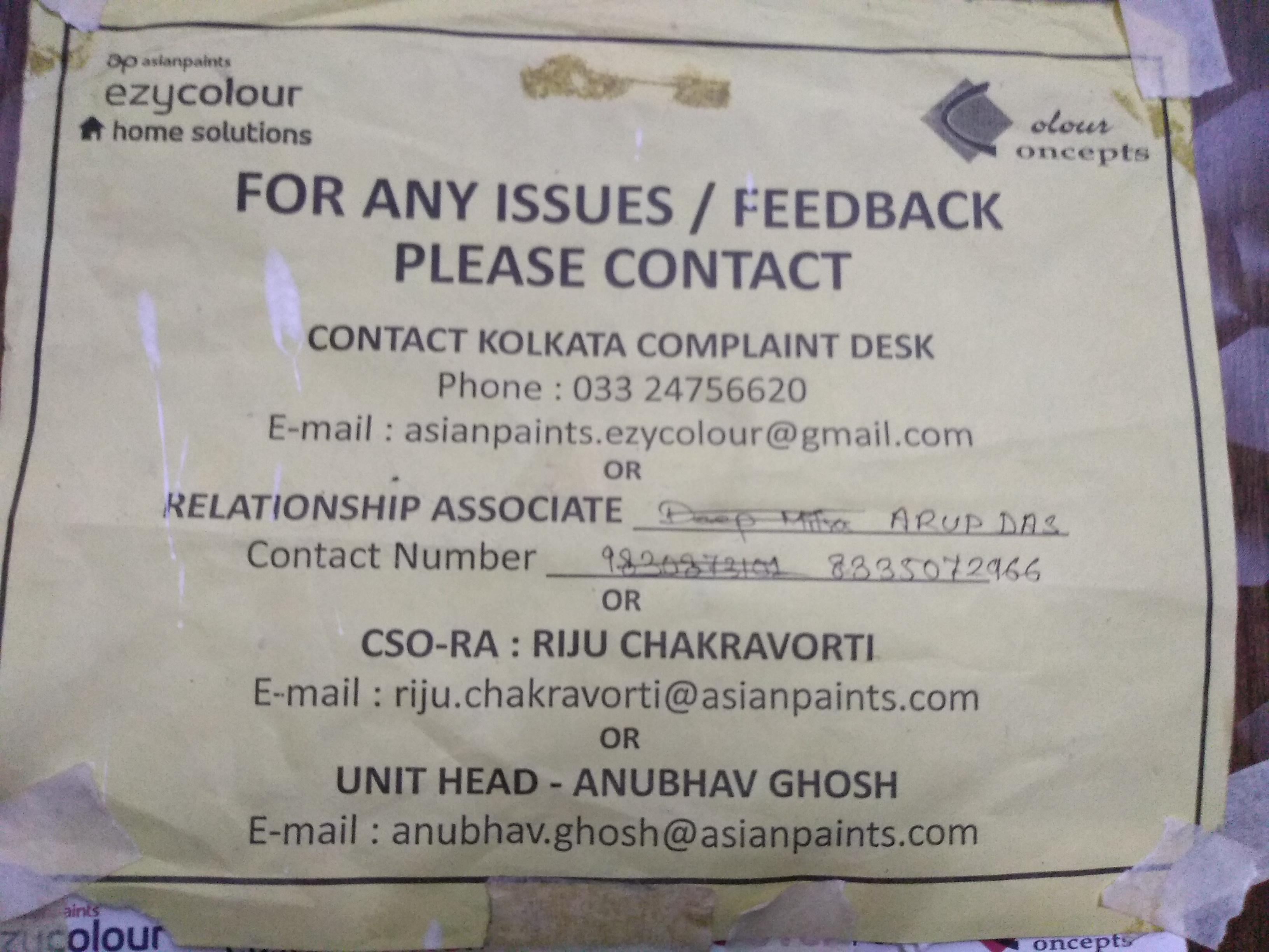 We got in a contract with Asian Paints(AP) to color our home from start to finish sometime around mid-2019. AP had a wing called Ezy colors which took care of everything. We paid AP an entire sum of around 85K and choose Royal Emulsion. AP brought home a contractor who was in-charge of getting the whole job done. As the work started the initial AP rep quit and a new person was appointed leading to more confusion. The job was even completed and COVID struck and thereafter the contractor also stopped picking up our calls and therefore the completion certificate was not signed. The painting job is still not completed and the quality of work is utterly disgusting. One of the workers appointed by the contractor did acknowledge that the job was not up to the mark and a lot of sections needed rework.