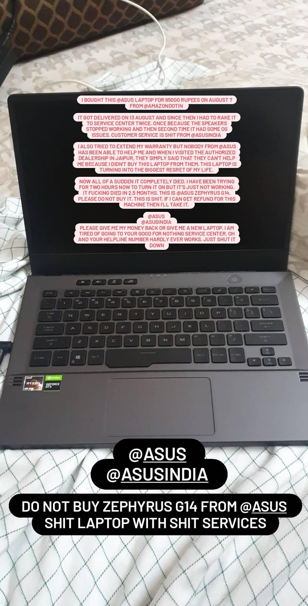 I went to the service center more than 3 times in 2 months to get this 90k crappy machine repaired. I don't want to get it repaired again so I called Asus helpline to replace the unit or refund me the money as Amazon wasn't able to help me since the return window was closed on 23rd August. Asus helping said they couldn't do anything as said their senior team will contact me with the next 3 days. I'm pretty sure they'll just ask me to get it repaired and will do nothing to replace or return this faulty device. I asked Amazon to help me so they asked me to get a service denial letter from Asus which they declined to provide so now Amazon can't do anything. I will also go to the consumer court with all the evidence that I have and see if they can help me. If they do then I'll be grateful because I know Asus is not going to do anything and I'll be stuck with this crappy laptop.