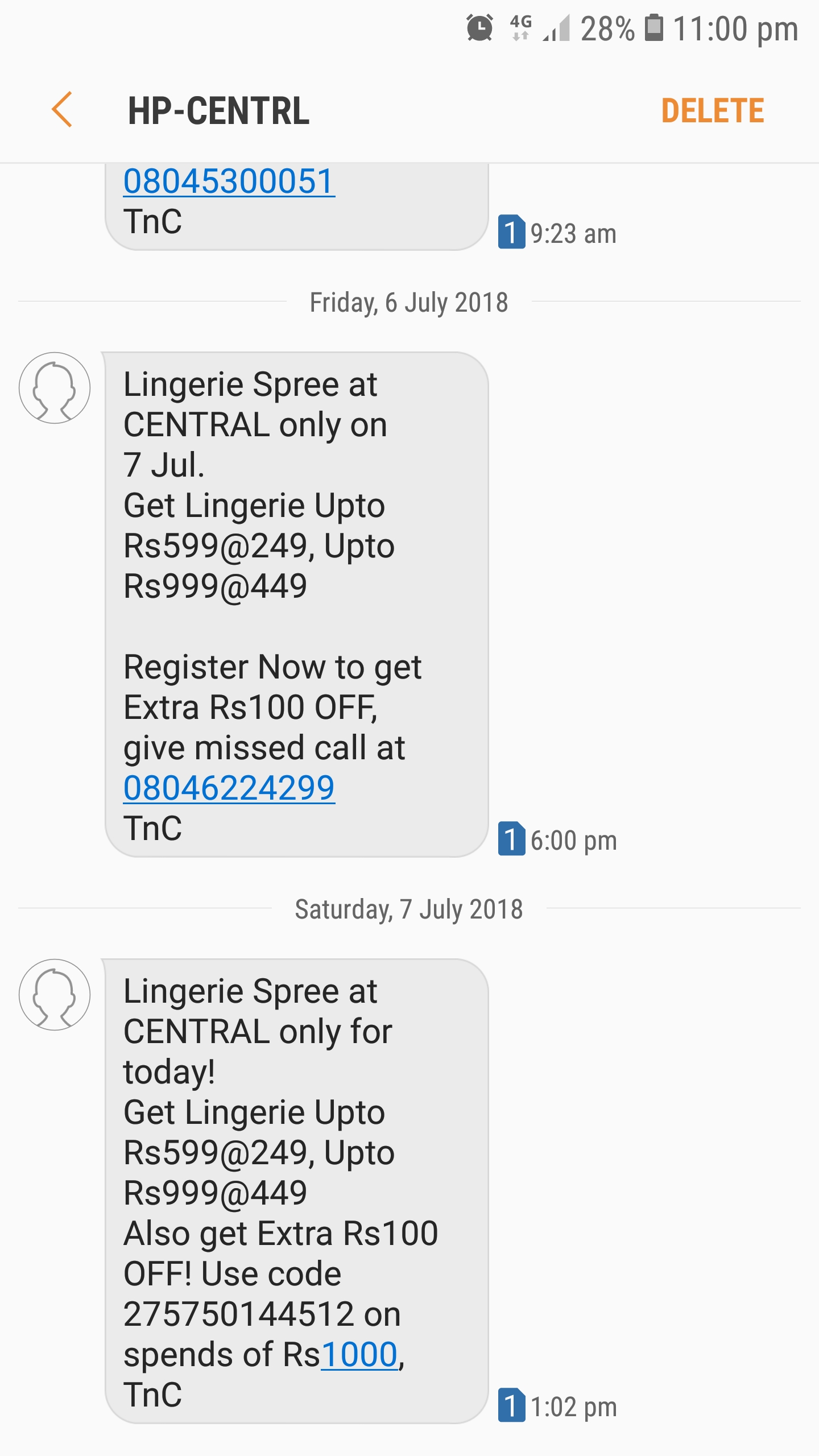 Date - 7/7/18. Bogus Central Mall Offer, Unethical Billing Cashier and a long wait at customer service. First I got an SMS from HP-Central about discounts on Lingerie. I gave a missed call to 08046224299 a then got a discount code by SMS. Me and my wife went to the Bangalore Jayanagar 9th Block Central mall, picked my products of a total value of more than INR 1000 to be eligible for the INR 100 discount. At the ground floor Lingerie section, my wife went for the billing. The cashier at the billing counter took the discount code 275750144512 and confirmed that the INR 100 discount has been applied. However on closely checking the bill, we found that INR 100 has not been reduced from the product total value. On confronting the cashier, he causally said he didn't realize it due to the billing queue pressure, advised to go the 2nd floor customer service to talk about it. We went to 2nd floor and waited in the queue, unfortunately picked up a quarrel with another customer who was equally frustrated for waiting in the customer service queue for a long time. Finally returned 2 out of 3 products and took refund. To me, it is a completely fraud move by Central mall to increase sales. Central mall has unethical practices particularly the male billing staff. Jayanagar Central Mall ruined my day. Invoice# 2409053000000037.
