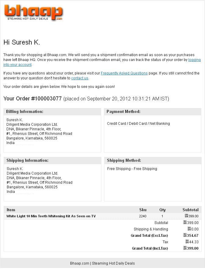 I placed an order (Order #100003077) on September 20, 2012 for White Light 10 Min Teeth Whitening Kit. Made the payment online...It was mentioned in the site that they would deliver within 19 days.