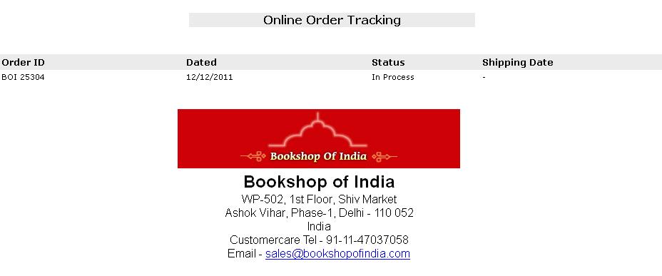 Their website claims to be Exclusive Distributors for the above book. I placed the order on 12/12/2011 and made the payment online, through HDFC Netbanking. After a week, I called their customer care to enquire about the Order (Order ID: BOI 25304). I was told by them that "I am not the only customer to serve". I was shocked to hear this. The customer service guy said that he would deliver it by end of the day.