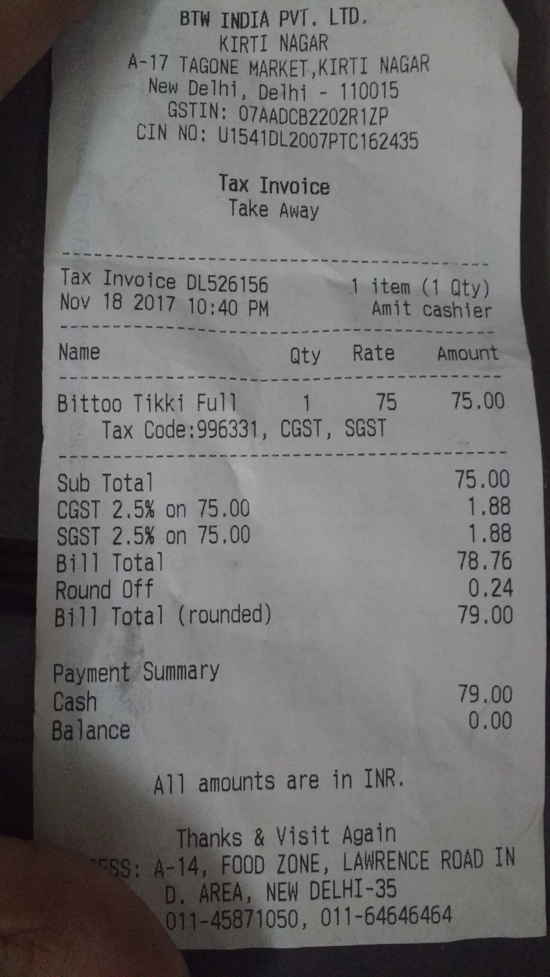 I recently happened to visit BTW kirti nagar outlet and definitely after having ordered once, I couldn't resist giving it one more try. I ordered the Aloo tikki which is one of their specialties, The food was nice in presentation as well as hygienic . The tikkis were prepared in olive oil and had nice seasoning on it .