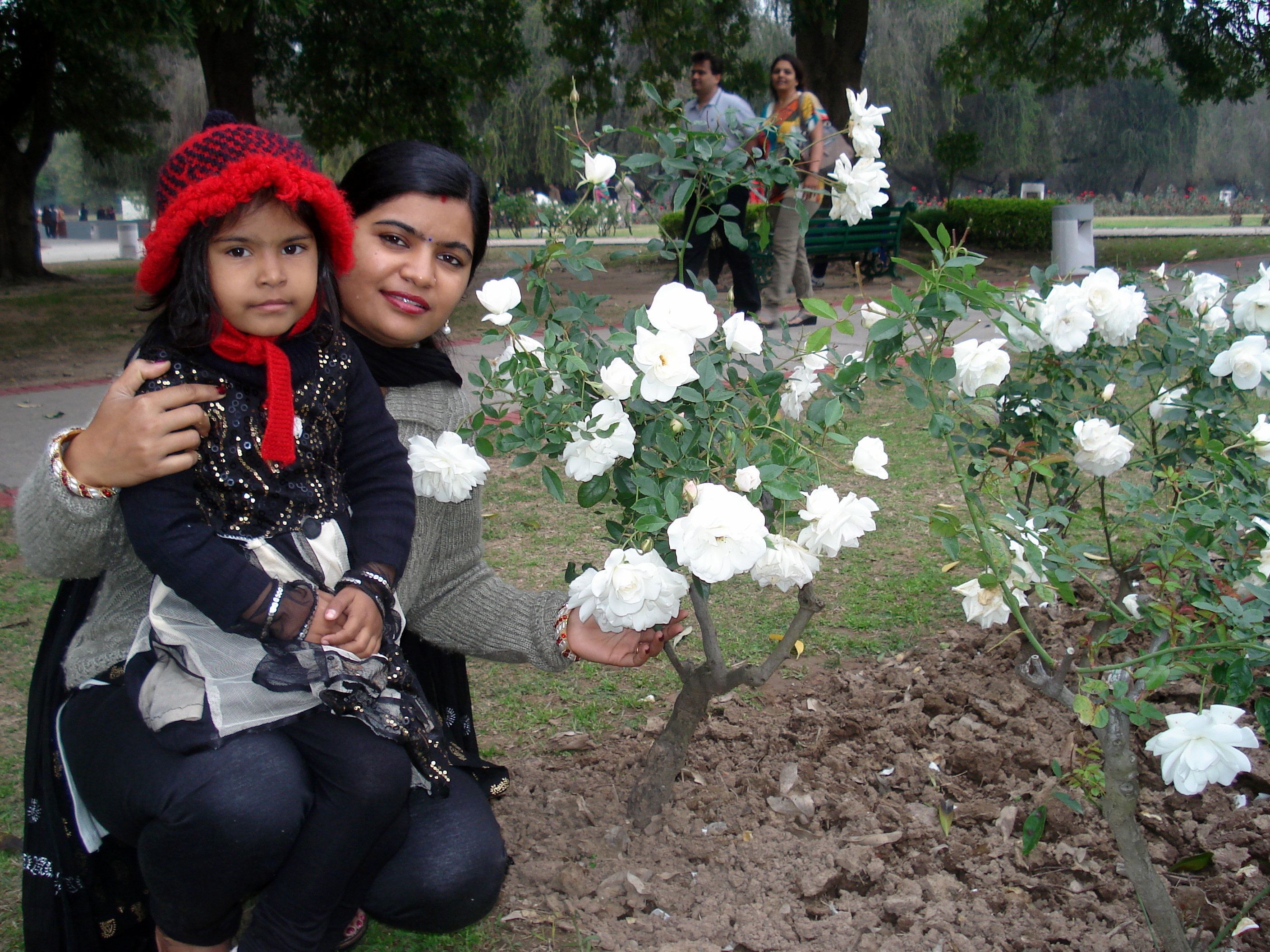 The entry to the park was free of cost. From here itself one can have a glimpse of the park. As it was not Saturday or Sunday, hence I feel the number of visitors were `normal`. At the start itself, I spotted roses by the both side of the concrete track. The name was written for the variety of the rose planted. My four year old daughter insisted for a photograph with the rose and she was made happy by the click.