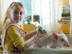 Charlotte's Web, ironically is about an unassuming pig; runt of the litter, who was rescued from being slaughtered by young Fern(Dakota Fanning). She names him Wilbur(voice of Dominic Scott Kay), feeds him with a baby bottle, wheels him in a doll pram and reads stories to him. and later, at the behest of her father, sends him to live in the barn of the farmer next door. Wilbur, bewildered at being separated from Fern, other than daily afternoon visits, tries to befriend other animals in his new barn ( 2 horses, 2 cows, 5 sheep, 2 geese, 2 crows and a crabby rat), but fails miserably. And then, in an ordinary barn, an ordinary pig meets an ordinary spider, and they click extraordinarily. Wilbur finally finds a kindred soul in Charlotte(voiced by Julia Roberts). However, his joy at finding a friend is short-lived, because he finds out that that before Winter ends, he is fated for the slaughterhouse. Charlotte, however, promises to save him, and she always keeps her word, she tells him. She must have been an advertising honcho in some previous birth, for she begins to spin words in her web, commencing with ''Some Pig, '' and the humans, coming from all over the country concur. In fact more than the humans, all the other animals too accept the sweet piglet, and they all pitch in to keep the novelty around Wilbur, and ultimately Wilbur, alive. The movie ends in a bitter-sweet climax, which leaves the viewer smiling with misty eyes, or in my case, sobbing and laughing.