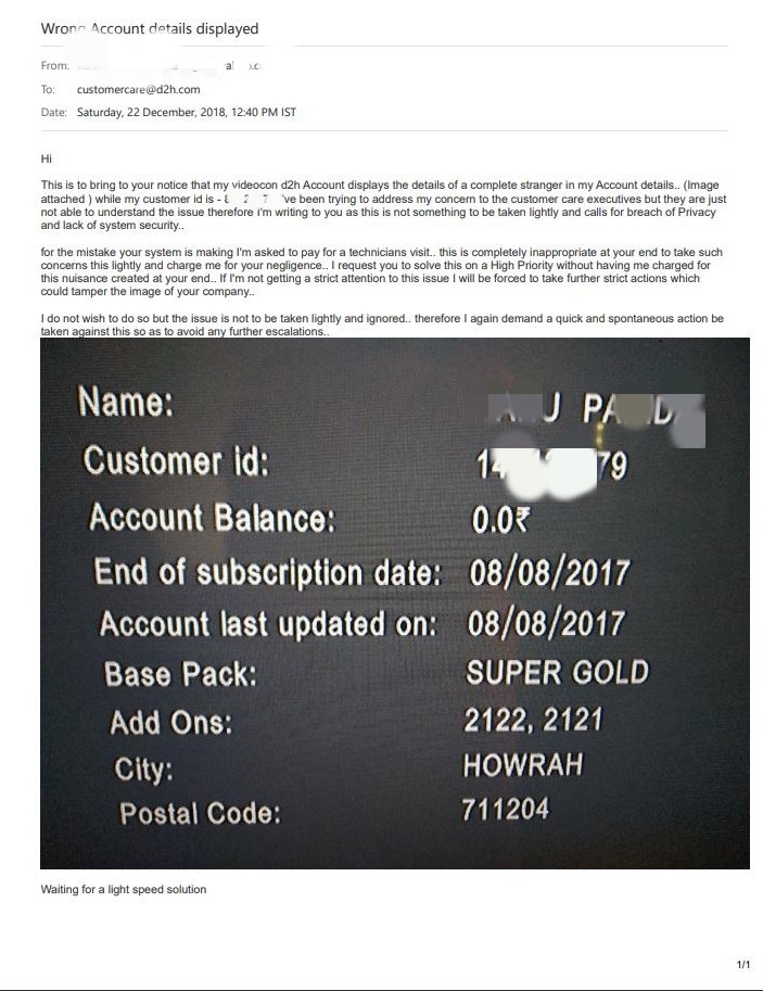 Recently I happened to check the account details on the tv screen due to the unusual pop ups I was getting.and what I came across is a complete different user name and a complete different profile having no signs of my account details in the profile. I immediately contacted the customer service guys. I was said my set top box needs to be replaced and that i'd be charged for that! .Now just Imagine. for eg. You have bought a smartphone and a sim card. the sim suddenly is appearing to be on someone else's name you don't know and the service provider is gonna resolve the glitch only on you paying for services. Sounds freaking idiotic right? The situation here is exactly the same with Videocon dth. They are charging me for their system glitches! How bold of them to charge customers for such breach of privacy! breach of personal information! and what not. a complaint against them can land them in big trouble but they are not considering the fact that how this could affect their goodwill. they just don't give a damn! Its pretty easy for me to get away with this by paying for the charges and not take this headache. but if I pay them for the service They will be able to get away with this easily without understanding the vulnerability of the data breach happening. If this is someone else's profile on my account there could be so many such errors one wouldn't even know. Just imagine all your details on someone else's account and you don't even know. and who knows how can they be misused!