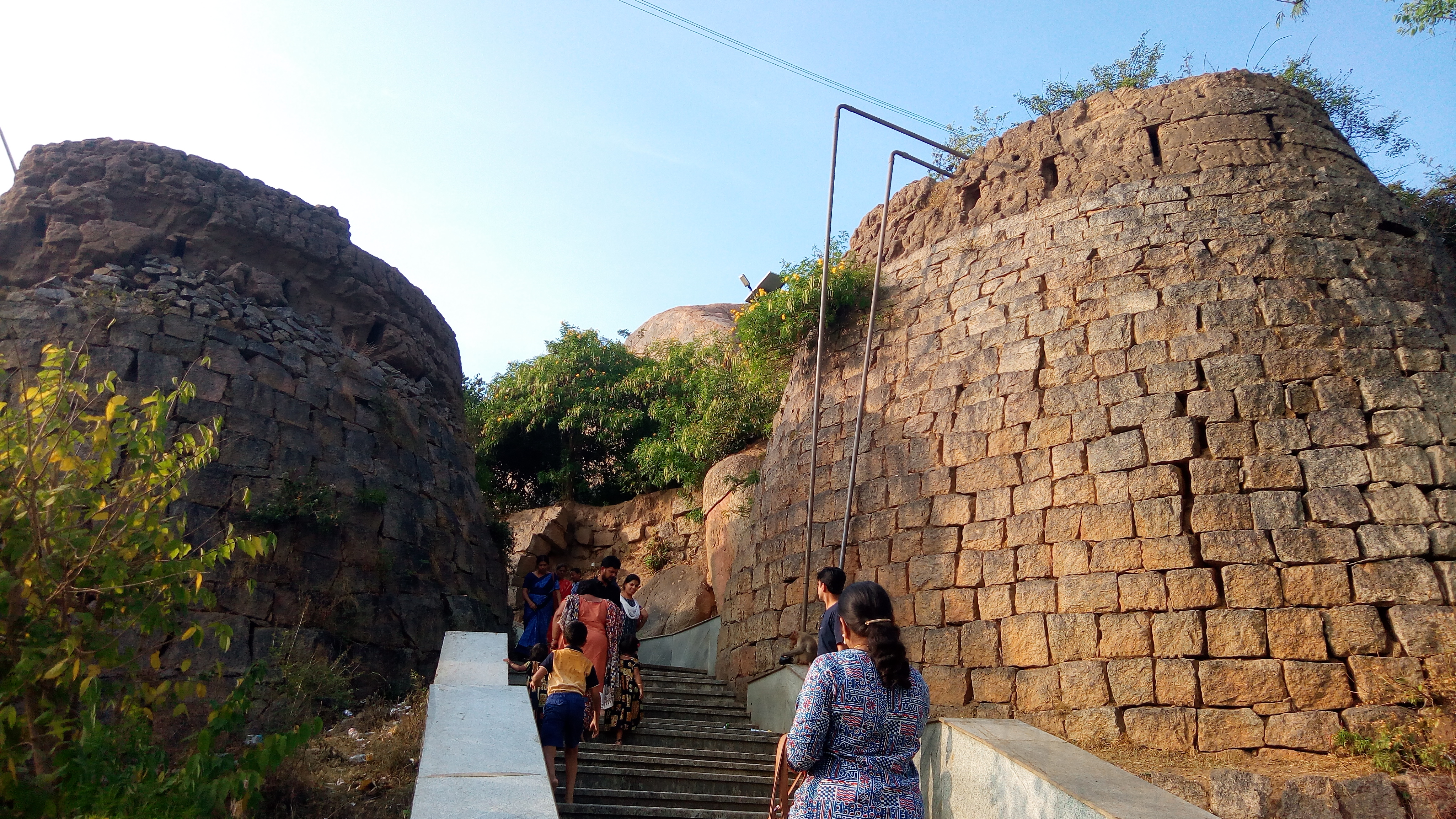 Once you start climbing the stairs, you can notice the remnant of the fort. At the base, there is a hanumaan temple and voga narasimha temple. Its better if the elderly people decide to visit these two only as the stone stairs are quite steep. There are plenty of monkeys on the way and for reasons unknown they just loved to eat Chrysanthemum flowers!