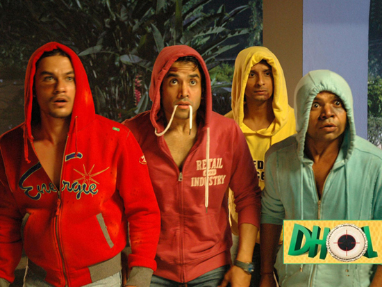 How clichéd! We’ve recently seen a spate of films in Bollywood where in a bunch of dudes -the numbers could vary –2(Garam Masala), 3(Heyy Baby) and 4(Golmaal) end up sharing an apartment/ house together, and keep screwing up over and over again. Of late Bollywood seems to be obsessed with this theme and “Dhol” is yet another off-shoot of the same. I am sure there is more to male-bonding than just sharing an apartment, screwing up and chasing skirts.