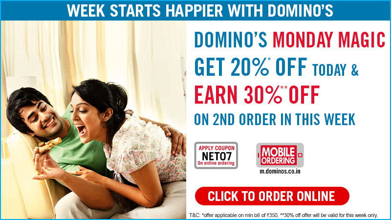 There are plenty of coupons available online and if you subscribe or have ordered even one from dominos online, you continue to receive coupons in your email. The most common is the 25 per cent off on orders above Rs. 350 or Rs. 100 off on orders above Rs. 400. However, there are also special coupons which come from time to time, like the Wednesday Buy-one-get-one-free coupon or the recent NET50 coupon which gives 50 percent off on all pizzas ordered between 11AM and 5PM.