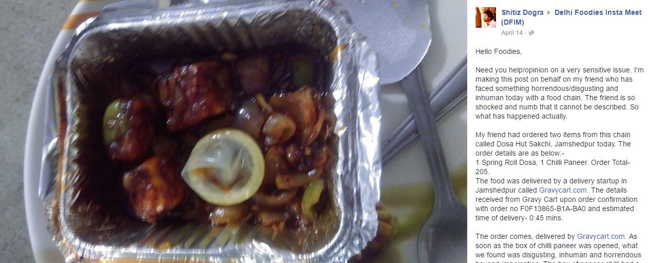 A customer in Jamshedpur recently had a gross and horrendous experience when she ordered paneer chilli from Dosa Hut in Sakchi, Jamshedpur via GravyCart.com