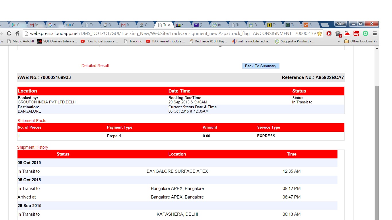 I bought one product from groupon and they shipped my product through dotzot courier on 29th sept 2015 from delhi to bangalore but after passing more then 8 days still product is not delivered to me, they also never scan product for 5-6 days and always respond that we will get back to you within 3-4 days.