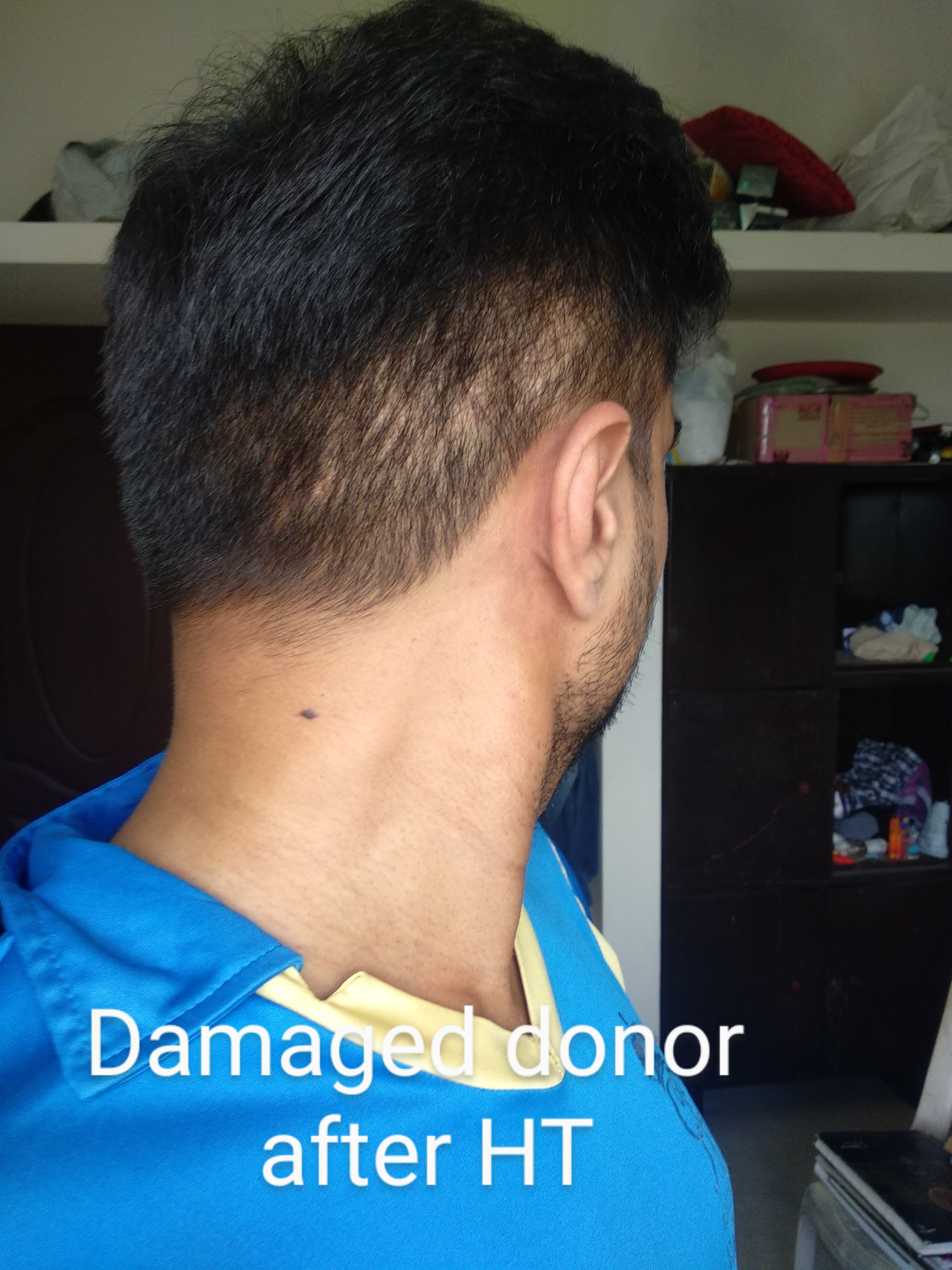 A damaged donor area will be the worst situation of your life because you cannot even shave your head after a hair transplant. Do you know that after fue you can't have short hairstyles in the donor area? When I sent my donor area pictures to the clinic, for 3 days they didn't even respond and then they replied to me saying to grow my hair to a minimum of 2cm and hide the damaged area. Otherwise, the donor area will look like a rectangular box — anyone will identify that I have done a hair transplant. Wherever I go people are staring at my head as if I am a freak, my life has turned upside down because of Dr.Madhu.