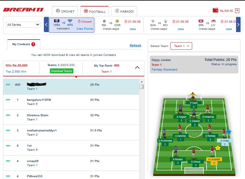 In this, you are getting 3 games yet which is Cricket, Football and Kabaddi respectively and you can make 6 teams maximum for a one game.