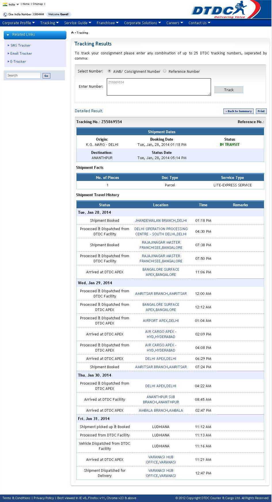 The shipment travel history says as it was booked twice on the same day at Delhi and Bangalore. Next traveled to Amritsar(Punjab) and again back to Delhi Next to Hyderabad, and back again to Amritsar and again to Delhi and reached ANANTAPUR and again traveled to Ambala.(Haryana)