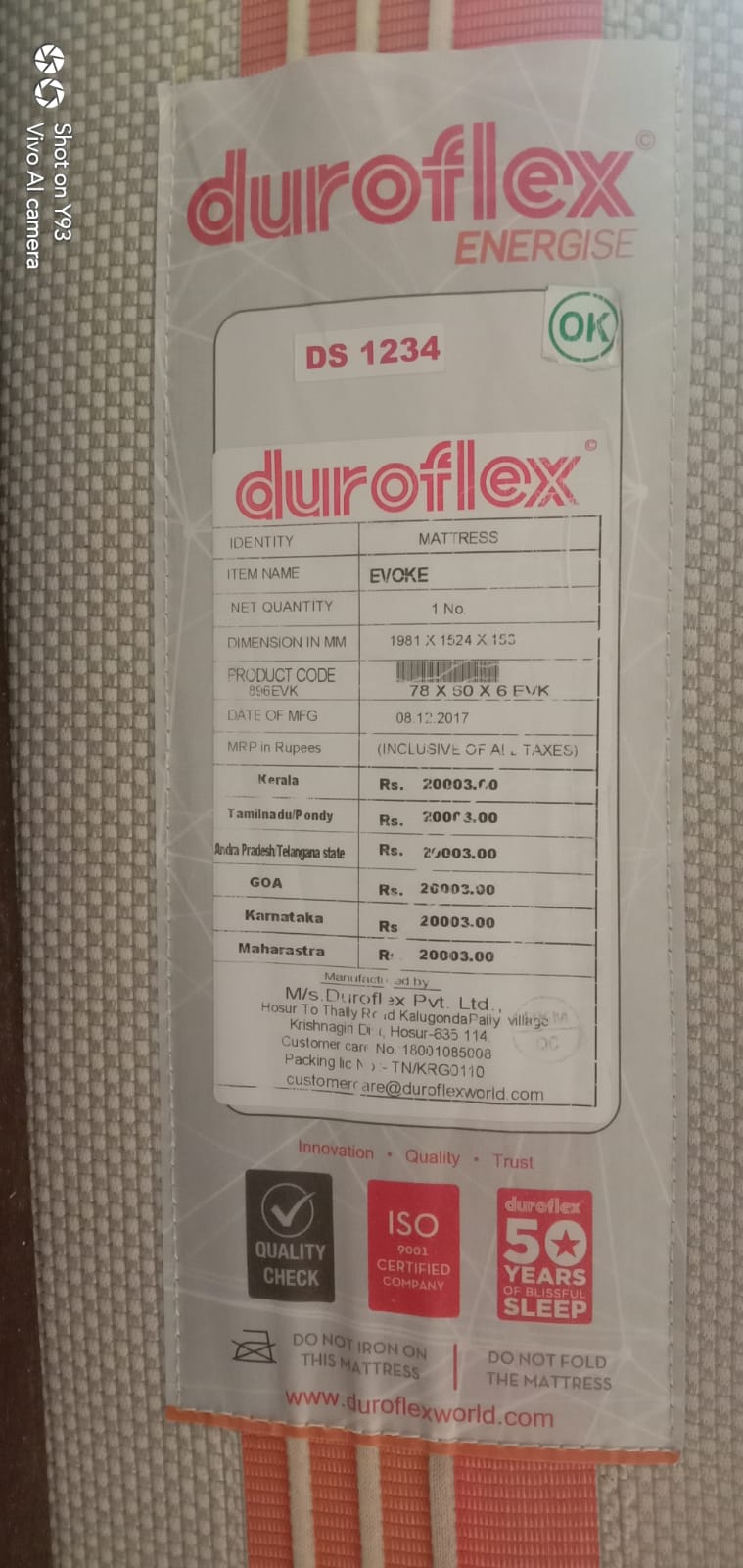 We bought a mattress in 2018 and as per the product tag sheet it says manufactured in 2017. Though the company claims50 years of blissful sleep, within a span of 3 years the mattress has crumpled on 1side , lost its firmness/ resilience making it absolutely uncomfortable and impossible to sleep on thatside causing one to roll off the mattress towards the edge and lose balance.