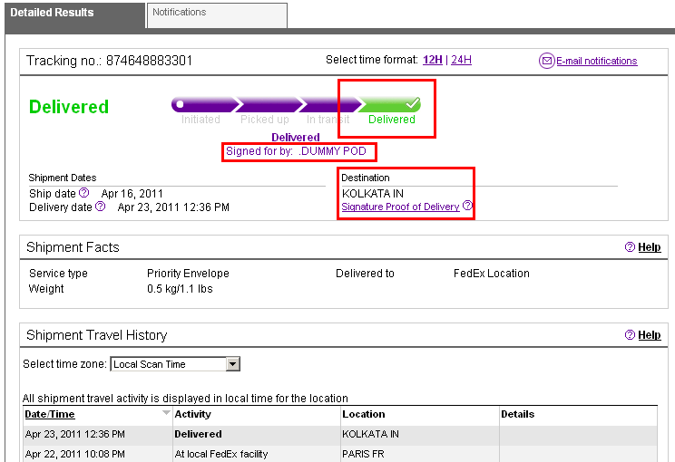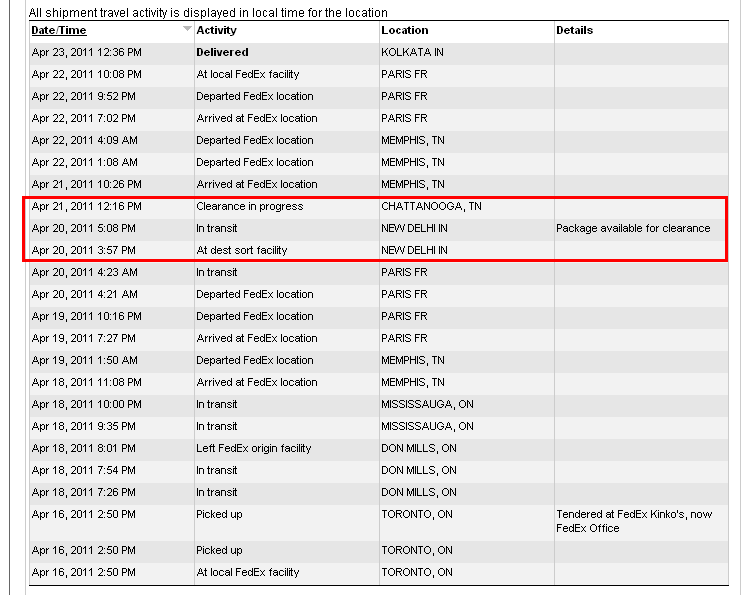 *2**. Please see the Exhibit A. They have shown that the package reached New Delhi on April 20, and at 5:18 pm India local time it was in Transit to destination. Notice the next line, where they have restarted the thing from Chattanooga, TN - a state in US. One aspect is clear - they did tell a lie in at least once. The customer service kept saying that package is in India, when in reality it was in US.