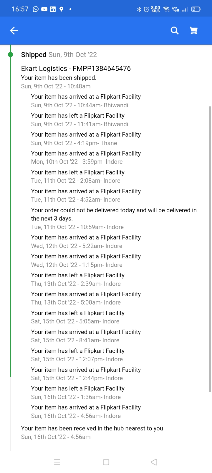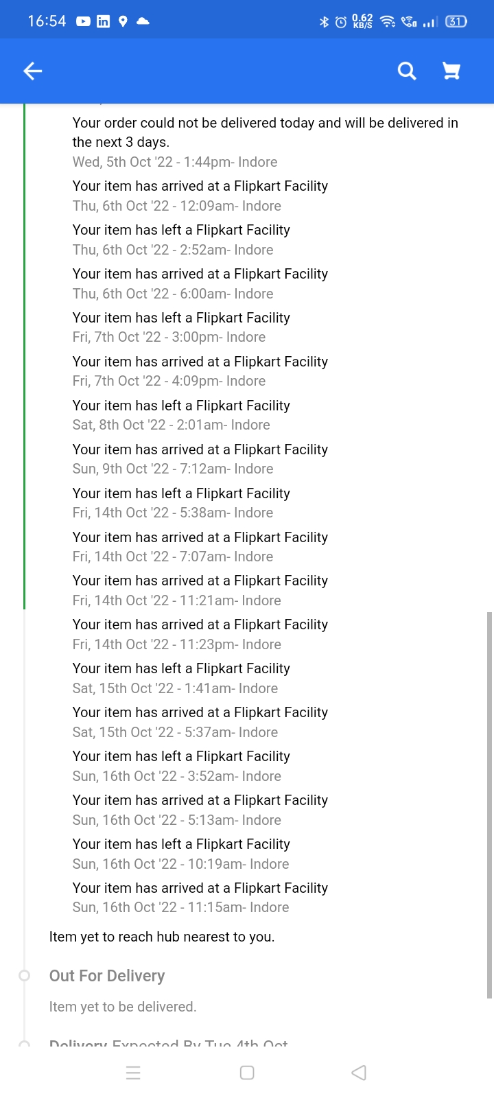 Even though I didn't get my products I have some faith in Flipkart's service till 9th Oct and therefor on 9th Oct, I booked another 3 high value items. Today is 16th Oct, Again the Items are shipped, arrived at my nearest hub and now there is a delay in delivery due to the sellers side.