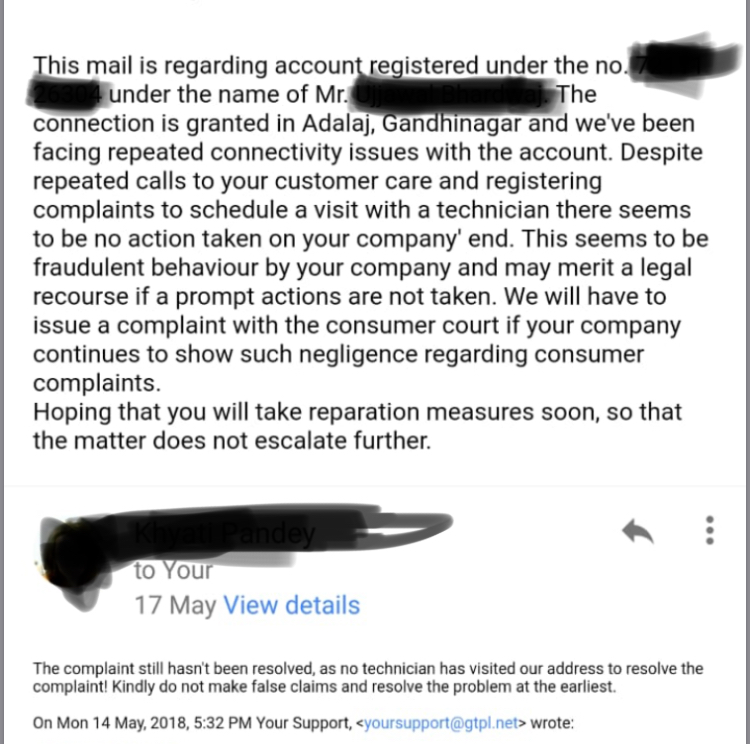 I am a resident of Ahmedabad and have been using GTPL broadband for almost 4 months now . At the time of registration connection, their team was very proactive as I was getting regular calls and visits from the staff to buy a new connection. Post paying a amount of 5, 000 for a 6mbps connection speed I have been facing connectivity issues since day 1! Everyday I have to call the customer service Dept and they revert back by saying I should use the facility directly on my laptop and not via router .