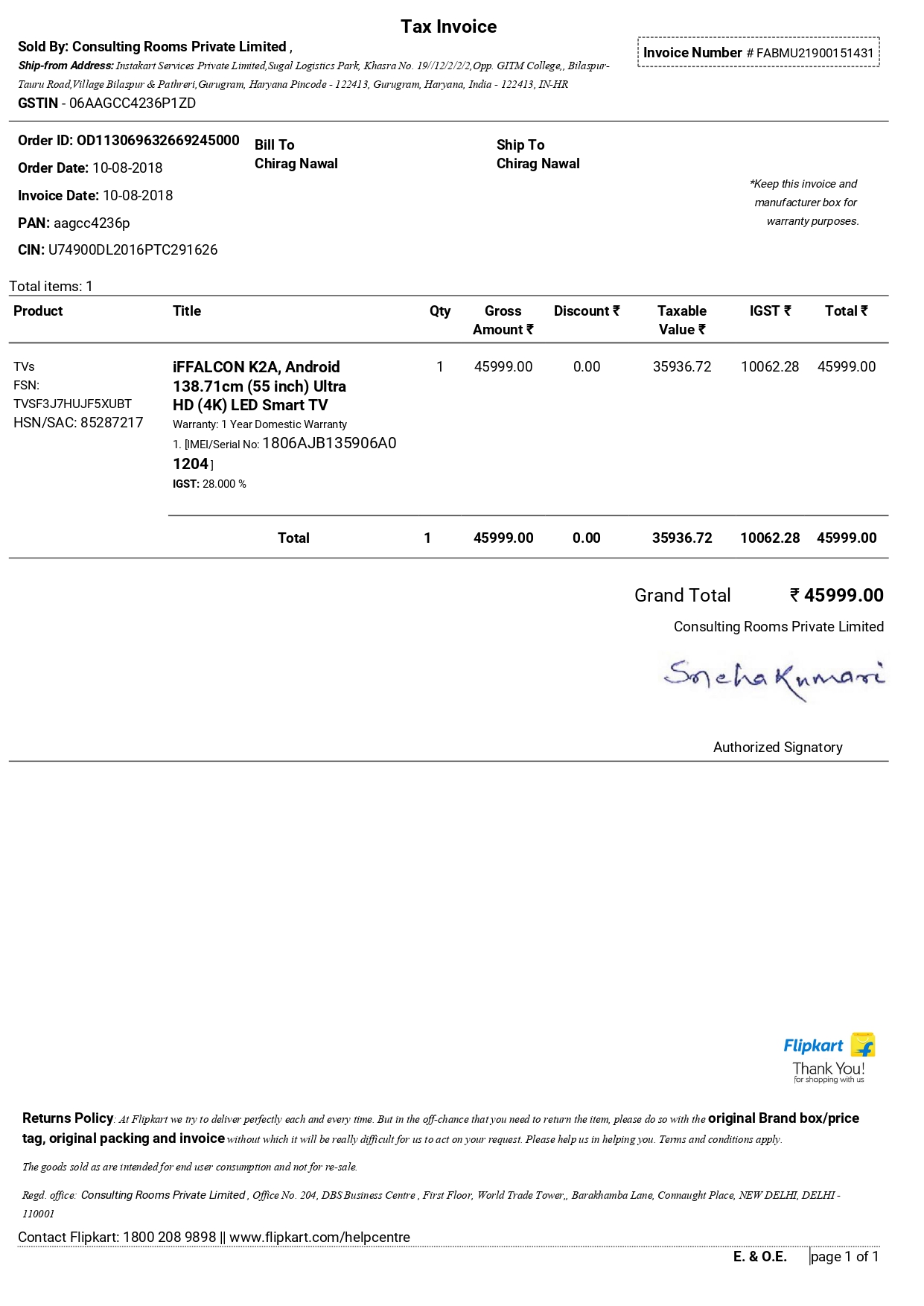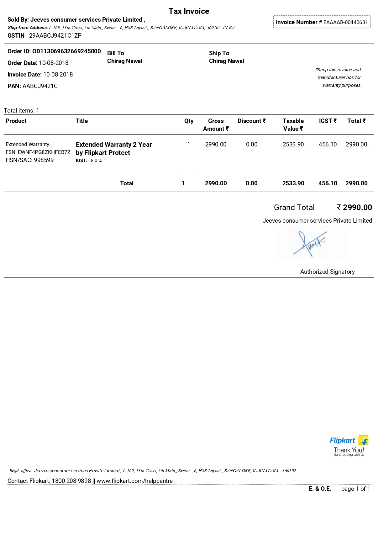 I purchased Iffalcon 55 inch TV from Flipkart with 2 years extended warranty from Jeeves.