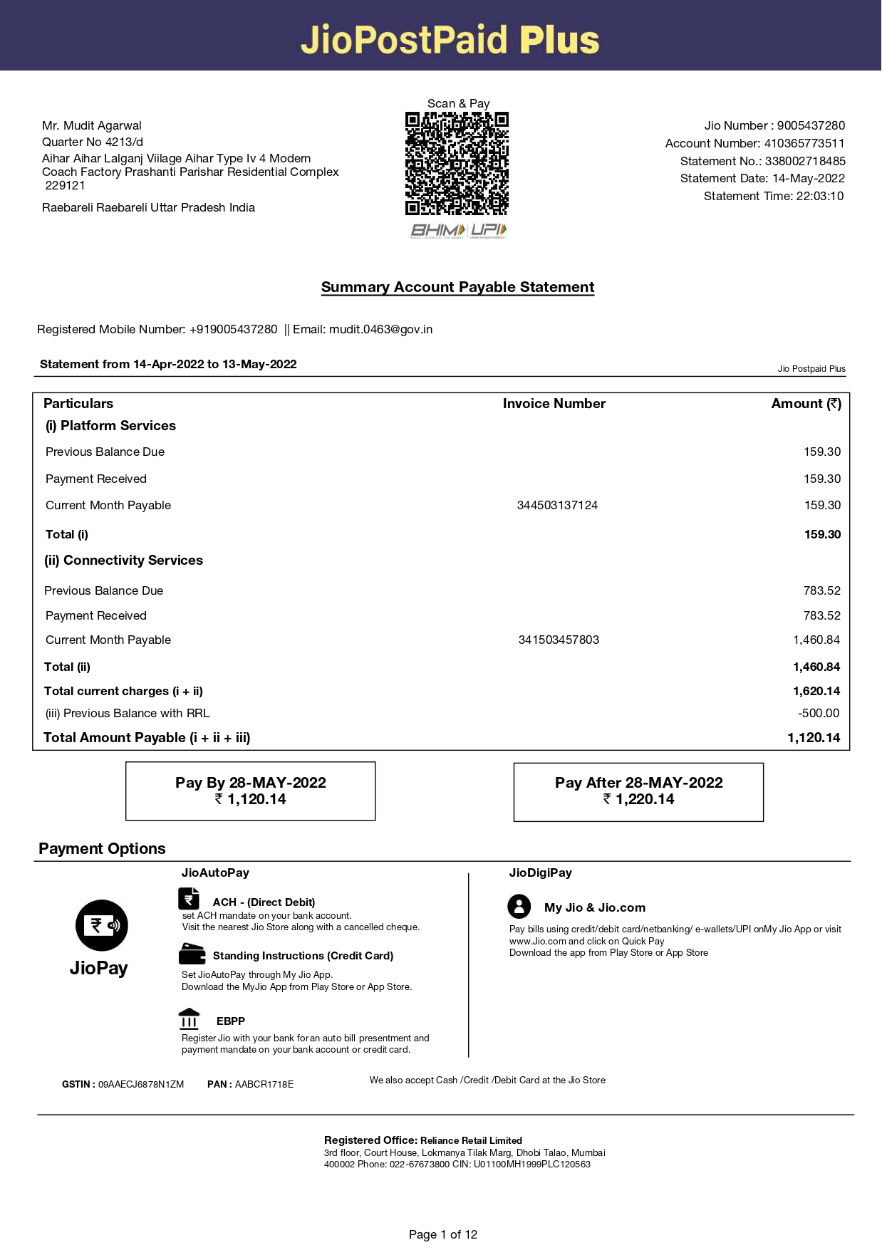(4)But as per per bill send by you Bill amount is Rs1620.20 and payable amound is Rs1120.20 duly adjusting Rs500 paid by me earlier.