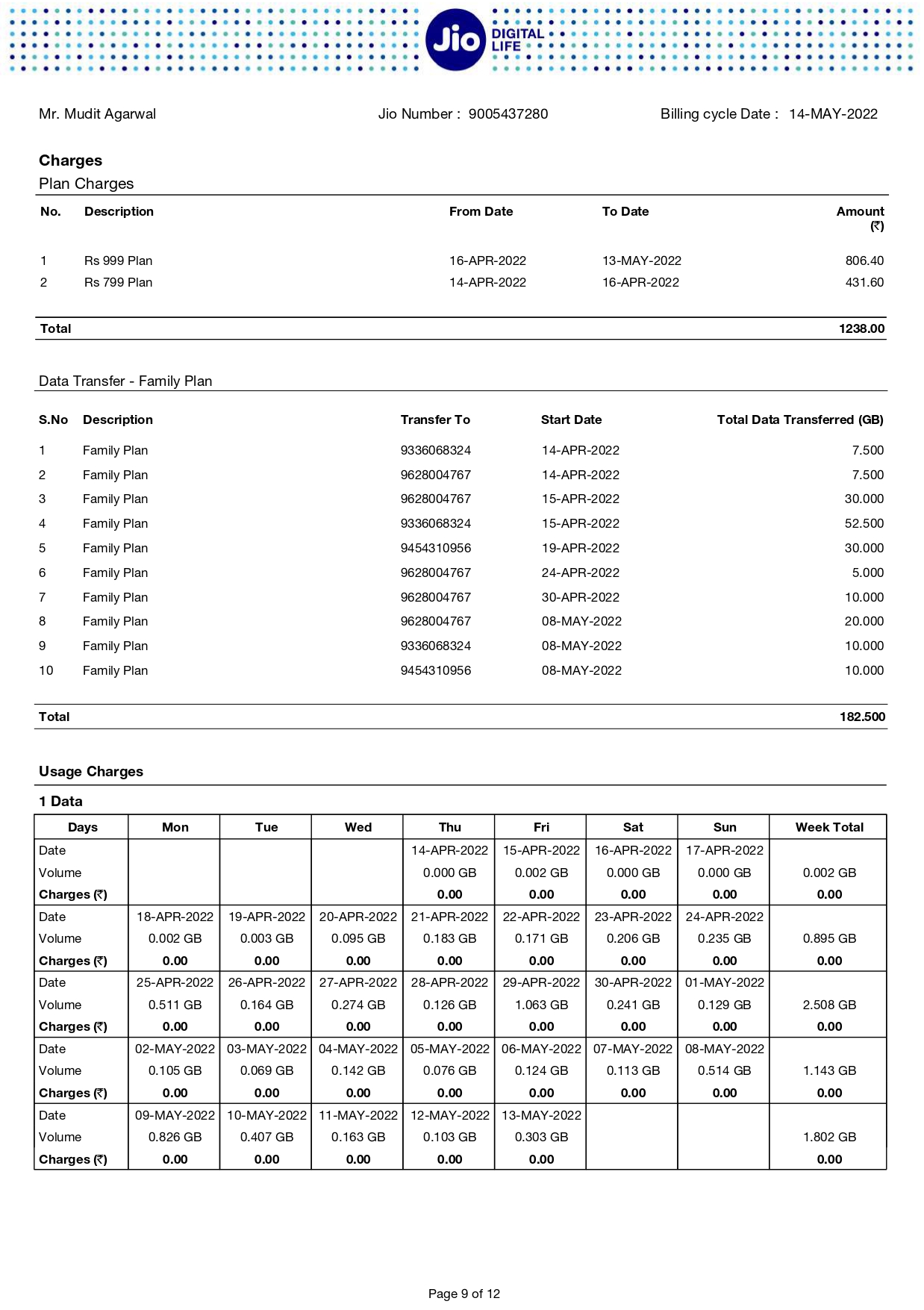 (8) For your kind information I want to inform you that for the period of 14/04/2022 to 16/04/2022 applicable bill plan was Rs799 per month and changed to Rs999 From 00:00 hrs as on 17/04/2022 for the period of 17/04/2022 to 13/05/2022.