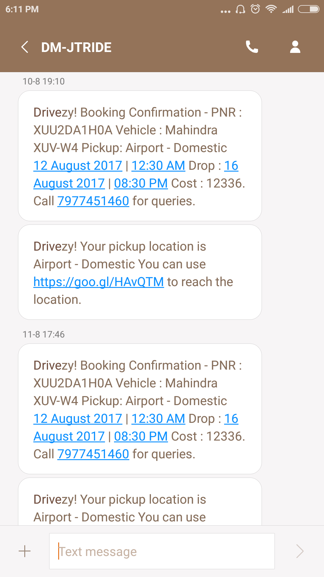 7.I reached Mumbai Airport at 11:50 pm(Night) and just after I switched on my phone I received SMS and Email from Drivezy with the same Car details which in the afternoon I was been told met with an accident. I called up the person to inform I have reached Mumbai Airport and by what time he will b coming to hand over the vehicle. He rudely answered- "I have already informed you in the afternoon that the car met with an accident then y r u calling me?. I replied saying. Before I left Chennai I called you up and you only said like u will b coming to hand over the vehicle." before I could end up my entire conversation he interrupted and asked me to call the customer care and disconnected the call. Now the time was around 12:30 am(Midnight) and I understood something fishy was happening.