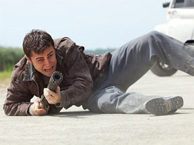 Joseph Gordon-Levitt looks more like the Max Payne with his classy Jacket and tie attire in a slick hairstyle while smirking at the table with his boss when he questions him about the whereabouts of Seth, he finally gives up the code of the secret hideout at his apartment under his living room rug, from where Seth is picked up by a wannabe Kid Blue(still learning to handle the long barrel 45-70 caliber pistol) to be executed who kills his future self as well.