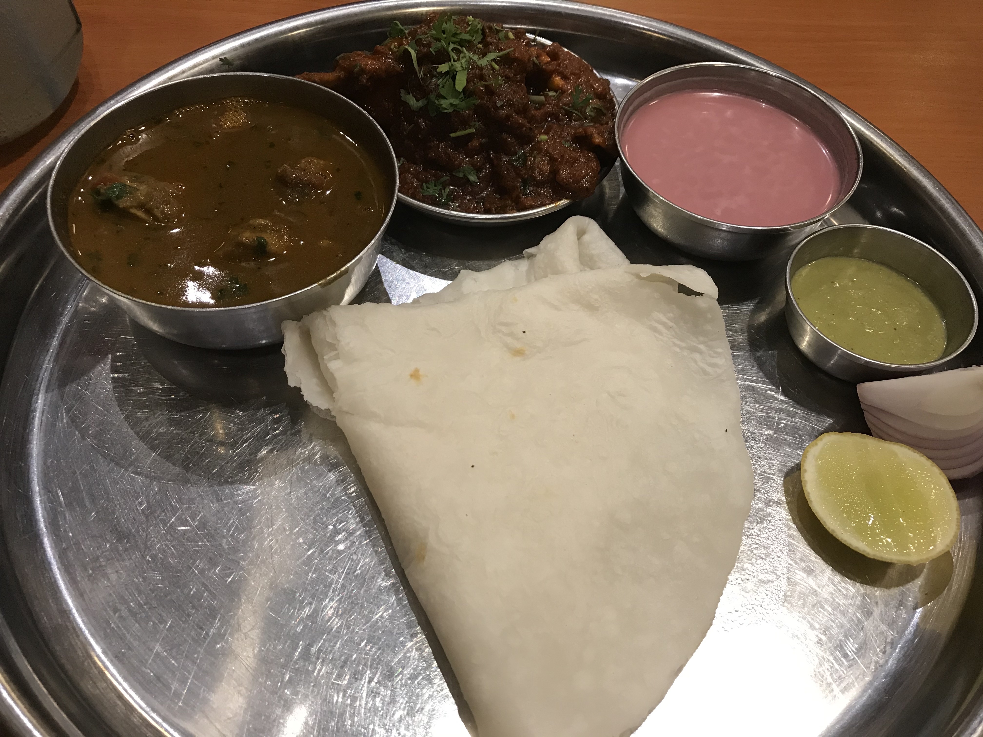 The NV Thali was served after about 15-17 minutes of ordering, maybe it was all prepared stuff that is just dished out since the curry mutton dish was cold, bhakri was cold and boiled mutton piece was just rolled into the thick masala in another vati and served where the meat was cold, sol kadhi in the Thali was warm.