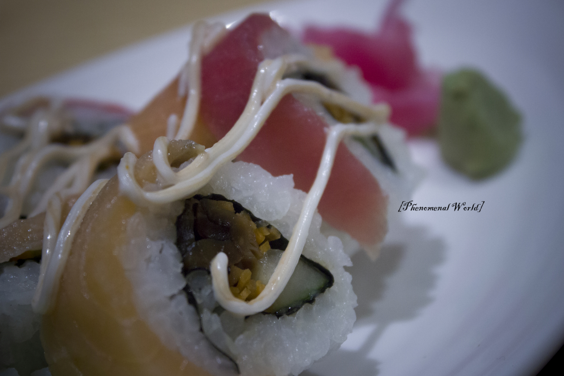 Sashimi – With an assortment of low fish like salmon, tuna and squid, this was very appealing. The wasabi was not the readymades used in other places. It had a natural pungency which added to the soy sauce provided the required zing. I probably would not have been able to eat the sashimi without this. Since Salmon and tuna have no flavors on their own, dipping them in this soy wasabi combination made it exquisite