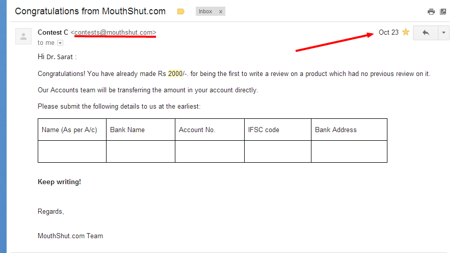 At first I was scared to send my bank details. Wasn't sure whether the mail was genuine or not. But I trusted MouthShut_Official.com and sent them my details.