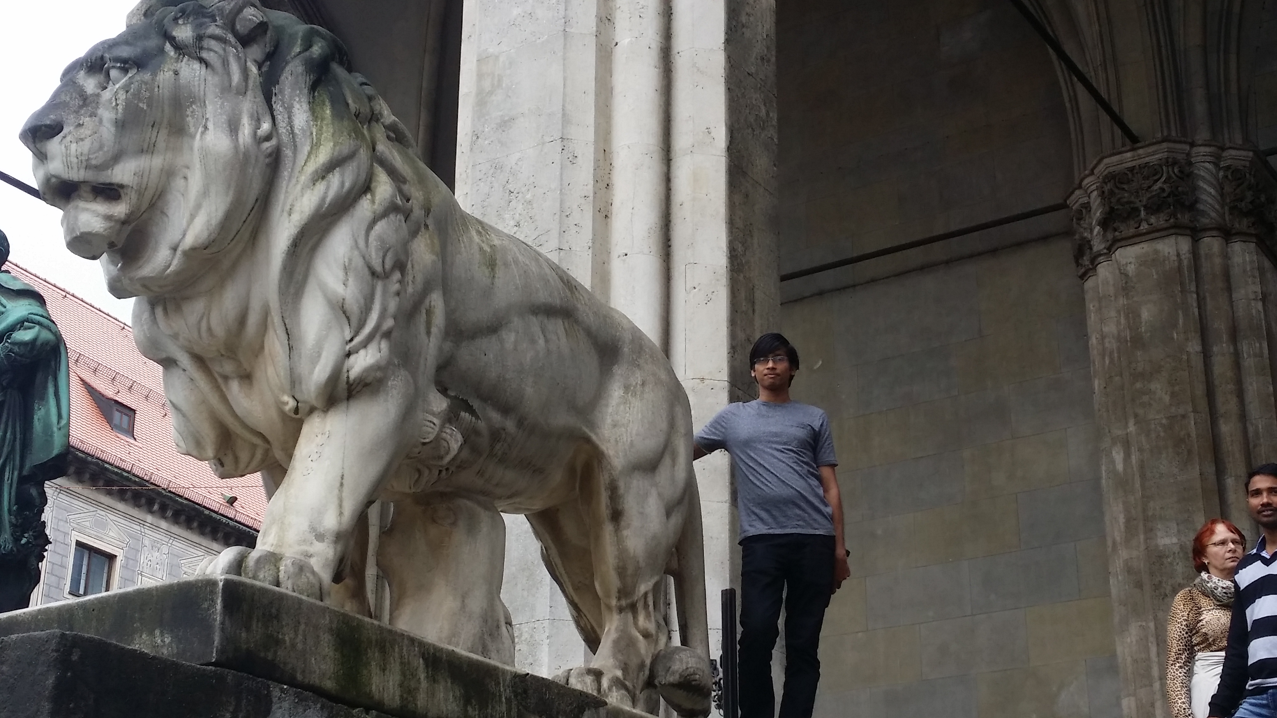 The **Munich Residence Palace**, in existence since 14th century was a former residence of Bavarian monarchs. Before one enters the main palace area, there is another building outside the entrance which has 2 huge lion sculptures at its entrance. There was also some program going on there at the time, which was interesting to watch. After taking some pictures and fooling around with the inanimate yet awesome lions, we entered the palace area. It has several courtyards, some interesting sculptures and now is a museum of art, antiques and textiles I believe, among other things. We maundered for a while, inclusive of some picture worthy moments.