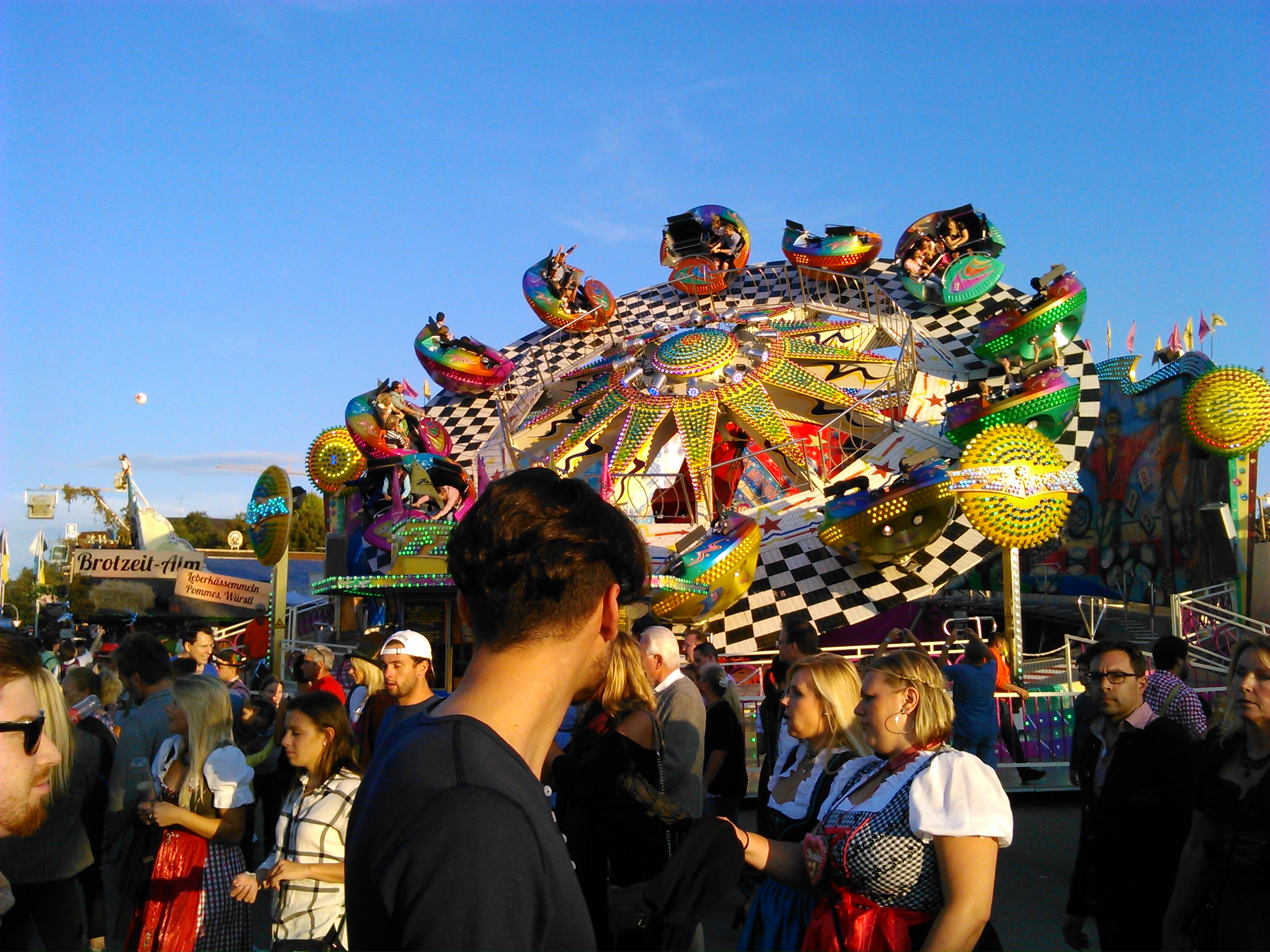 Once we were done here at around 3 P.M., we headed back to the main station. From the main station, we walked along Bayerisch Strasse, till we had to turn left towards Paul-H Strasse. Then onwards, we kept walking till we reached the **Oktoberfest carnival** location. I’m not sure if the location is the same every year. The festival is said to have originated in Munich, now a popular theme throughout Europe at around the same time. It is essentially a carnival where people from several parts of Germany get together in traditional clothing and have a good time. Lot of tourists too. One could enter a stall / tent to grab a beer or one could just enjoy the fun fair with all the amusement rides and the various food and drinks it had to offer. I am not much of a drinker so I just had fun walking about, trying out food and the amusement rides with some others while some enjoyed the beer festival. I tried a **“Haunted House”** ride which seemed anything but horrifying to me.:D Finally, it was evening and we’d had an enjoyable time. So had the few who had entered the beer stalls. They were on quite a high when they finally came out and we had an exciting time trudging back to the main station, where we would catch a train back to Stuttgart.