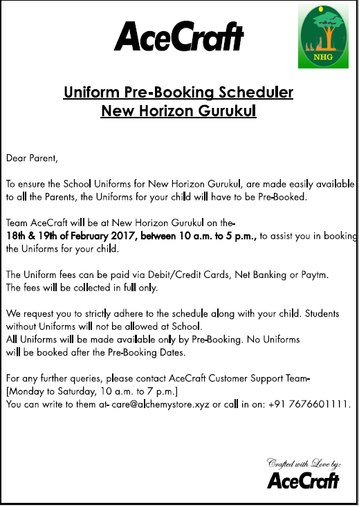 It has put up a recent circular asking parents to pay for their children's uniforms for next year! This is two months before the academic season is yet to begin. The fees have to be paid in full, and parents have to select the wards' uniforms in two days! Earlier they used to get a month's time to buy uniforms from the premises itself. Circular attached for reference.