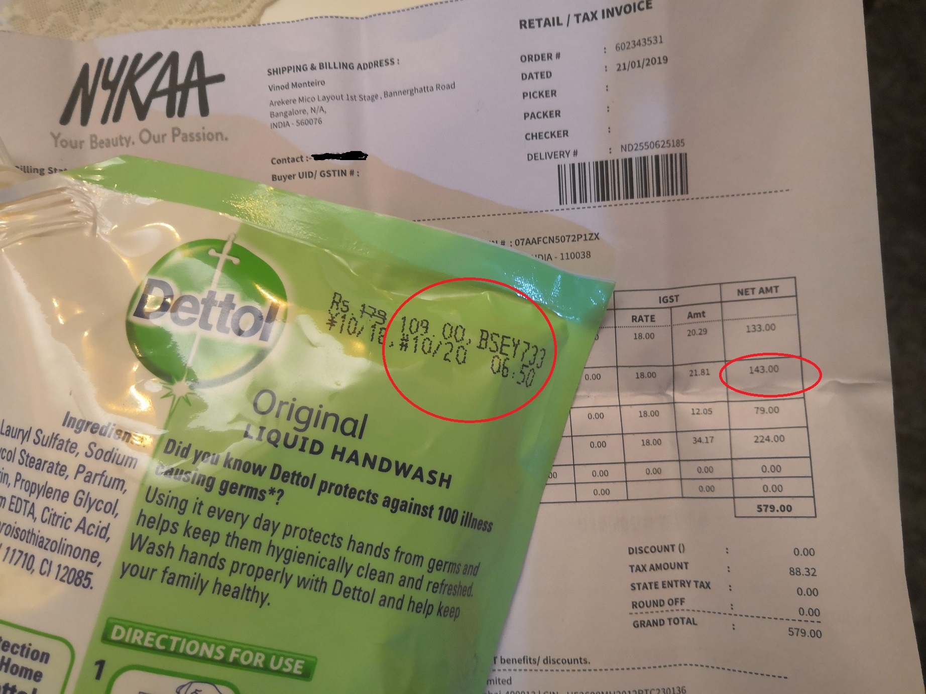 One of the items was Dettol Hand Wash 750 ML - As per them the MRP was Rs.179 and discounted price was Rs.143 . When the product reached to me, I was surprised to see that, the MRP was only Rs.109 not 179 .