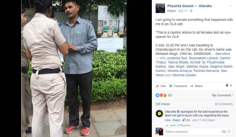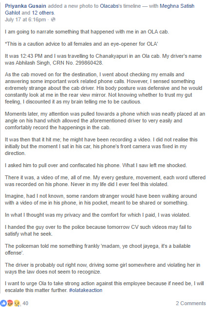 Priyanka Gusain boarded an Ola to Chanakyapuri on a Saturday afternoon. She noticed something fishy about the driver's sitting posture. When she realised he was recording her video, she felt violated. She took him to the police station to lodge an FIR. He was detained for a day or two. As it was a bailable offence, police asked her to file a complaint with Ola. She raised this issue with the cab aggregator and all the management had to say was, "Apologies for the bad experience the team will get in touch with you regarding the issue."