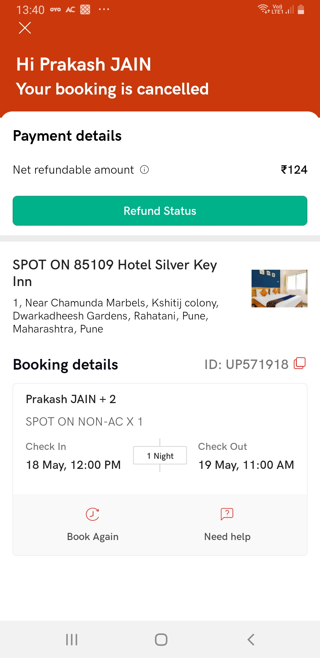 I have made this booking at OYO 85109 on 17th May. I was bit skeptical and called up the hotel to confirm about my booking and to my surprise the hotel person said he will not give me the room at the booked price and I need to pay Rs 1000/- if I want Room or should reach out to Oyo for resolution. I called up your contact centre and they paid balance amount of Rs 582/- as a voucher to the hotel directly to resolve this. I was under the impression that issue is resolved and reached to the hotel directly spending Rs. 356 for a cab on 18th May 2.30PM for checking in. Upon arrival The hotel person denied to give the room stating the pump has gone out of order and there is no water supply. He has also confirmed that they have informed you about the same but still Oyo is continuing with fresh booking. Once again I ended up calling your contact centre and was put on hold for 10 mins post which the call got disconnected from your end . I have requested them to help me getting room in another Oyo but there was no response except the auto mail acknowledging my complaint. In nut shell we were left on the road in scorching heat without any resolution. My family was so upset and forced me to book another hotel not through Oyo this time. I was left with no choice then to take room in another Oyo Flagship 78142( through booking.com) and paid Rs. 1264/- I hereby request you to refund the following amonut to me on priority 1. Advance paid Rs 124/- at the time of booking 2 cab charges to reach the hotel Rs 356 3. The differential amount I ended up paying to book room in another Oyo Hotel through booking.com Rs 762( 126 -) The worst part is that you cant reach out to customer care team responsible for refund as there is no option of selecting refund desk extension on their IVR when you dial 931393 . If you select fresh booking, they just tranfer the call internally & no one picks up hereafter even after waiting for 15 mins. Sharing the screenshot from my OyO app clearly stating a reund of Rs. 124/- against this booking. More than 45 days have passed and I am yet to get this amount back despite repeated assurance's from OYOs SM escalation team.