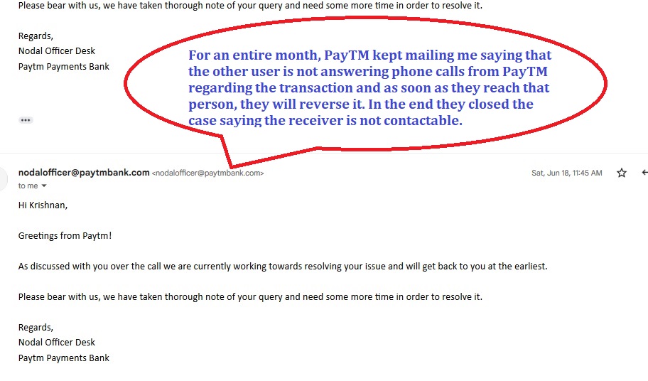 I accidentally punched one digit wrong while recharging my PayTM FastTag and the recharged went through almost in microseconds giving me no time to cancel it. I immediately notified the payer wallet who told me to contact PayTM. I also have a PayTM FastTag and this company could easily see the stark resemblance between the vehicle number of mine as well as the one I recharged and given that the payment was done by me, what further proof or verification do they need? Their argument is that the receiving party has a PayTM FastTag account and he was ignoring calls from PayTM.(My vehicle number ends with 3868 while the one I recharged was 3968). In every such case the receiving company, be it a telecom provider, or a bank has always refunded the money into the source account which PayTM is blatantly refusing to do despite me escalating to RBI Ombudsman. They even have repeated the same one liner that without the consent of the receiver they can't do anything. How do I even know who the receiver is and how am I to trace that person down when they are not giving me that person's details even?