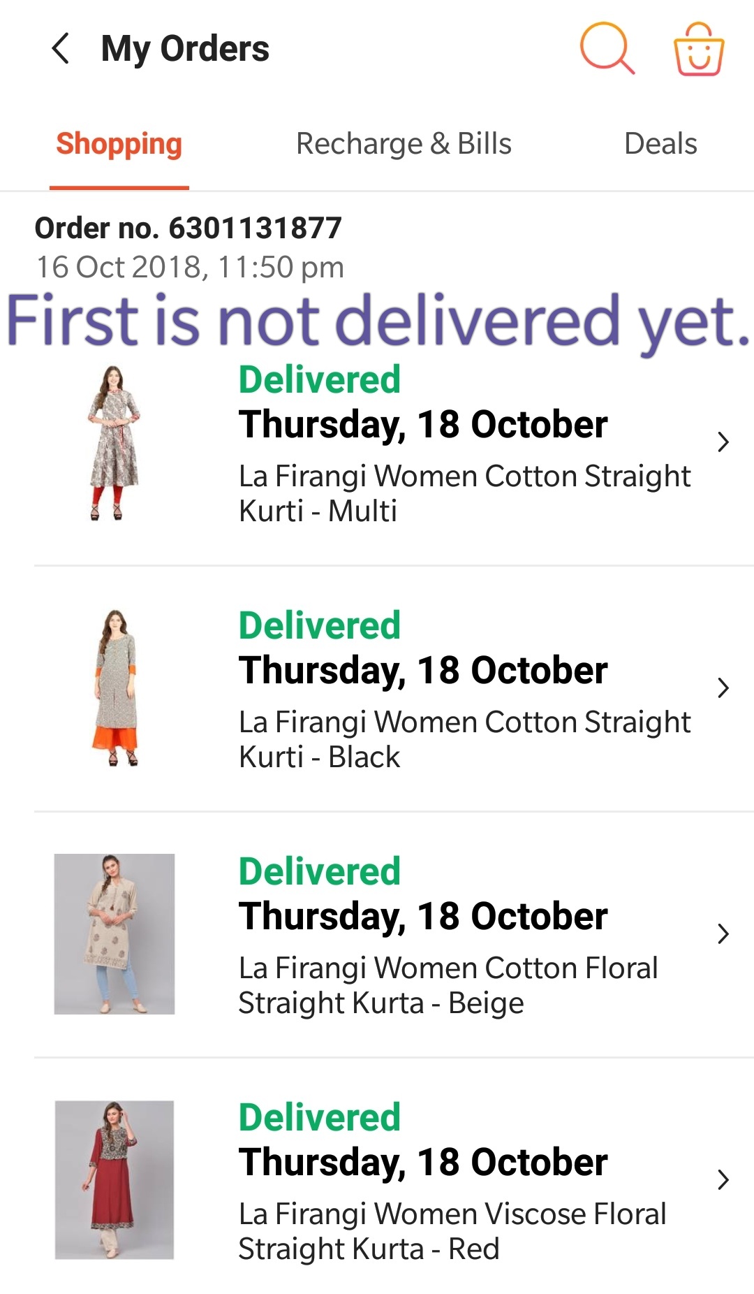 I ordered 4 kurtas via Order ID: 6301131877, but only 3 were delivered out of the 4 whereas my account is showing that all 4 has been delivered which isn' t true. The missing item is the Multicolored Kurta which I wanted asap as I ordered it to gift it to someone. I was eagerly waiting for the product and it is showing delivered whereas it isn' t.