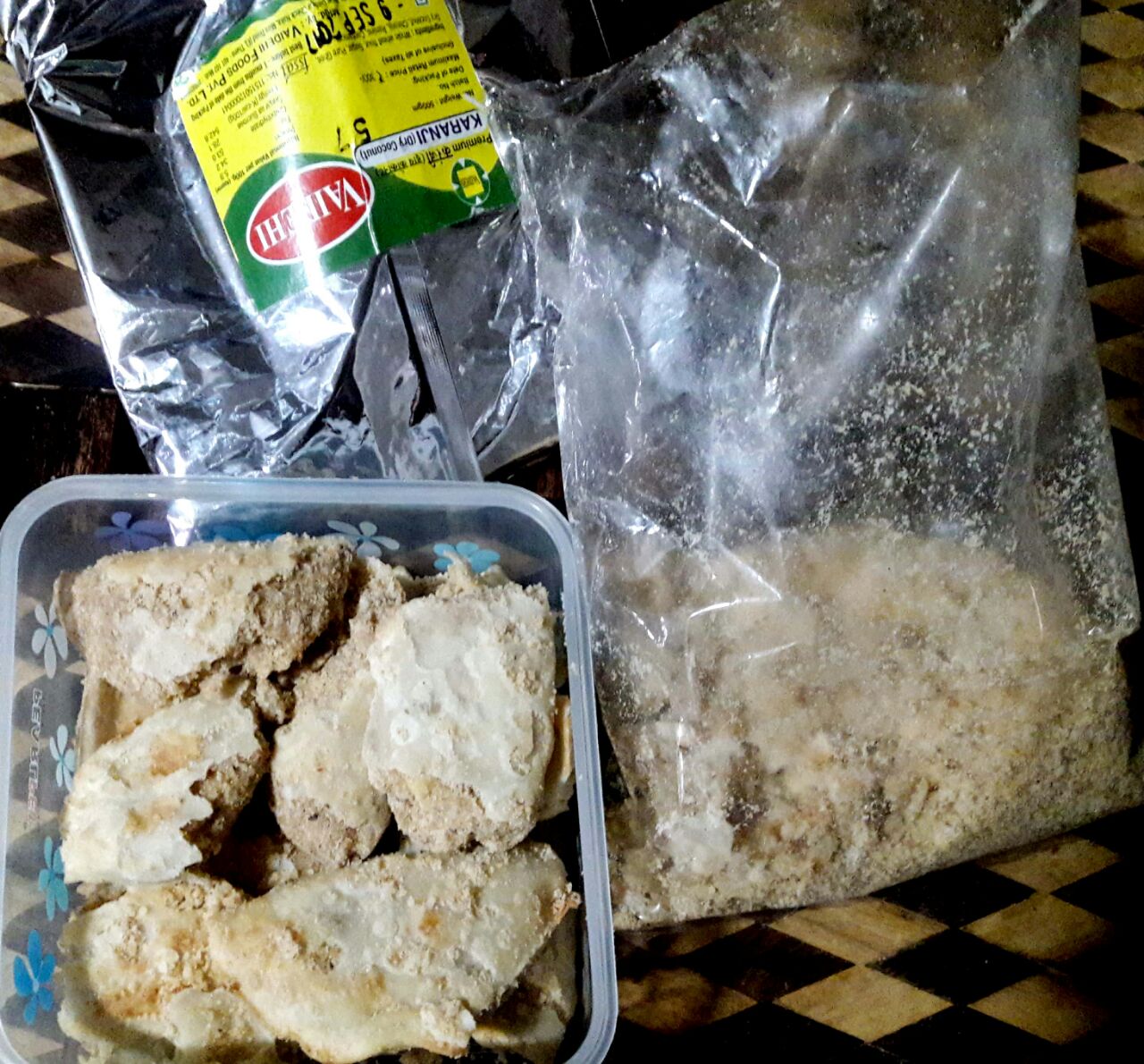 Cameras dont lie. Check out the images- The first image has broken Karanji which we shook out of the dust and powder in the packet and have put it into our container
