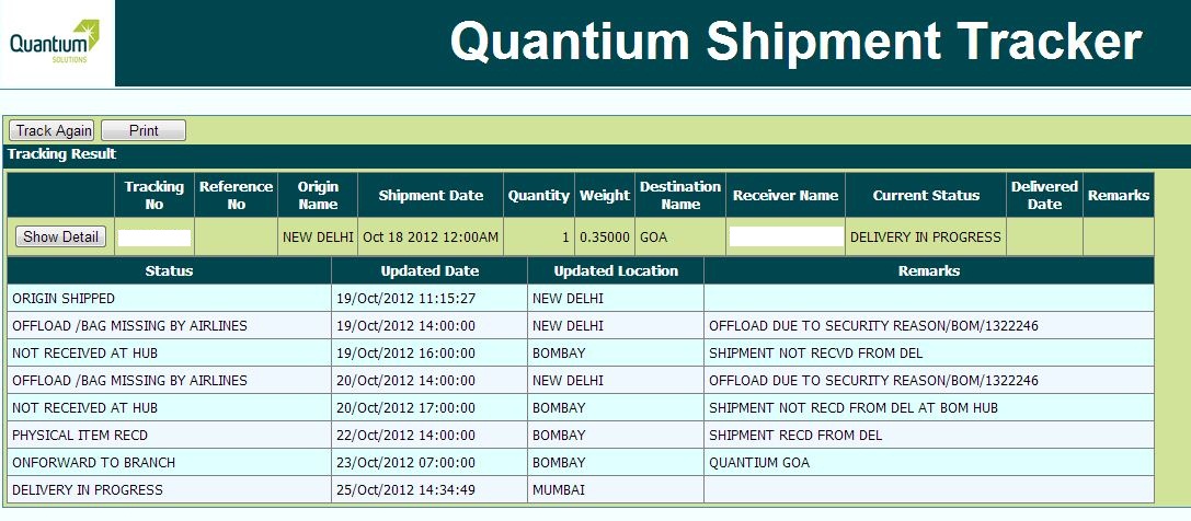 I called up Quantium Solutions Couriers Bangalore office, lady was not even ready to listen to my problems and said that shipment was offloaded by airlines due to some reason and it was not their problem since it was offloaded, I asked her is it my problem that it was offloaded and then in a second she gave me their local Goa partner number, I took it down and immediately called their Panjim partner number, he too gave me another number from my area, Distance between Panjim and my house is 30 km but it took them 3 Days to Transfer it from Panjim to my area of their local courier 25th to 27 Oct 2012, I called both numbers and both blamed each other for delays, time I had called them was around 3 in afternoon, they only kept promising " Monday Sure sir ", that will be 29/10/12 almost 10 Days in transit from Delhi to My House,
