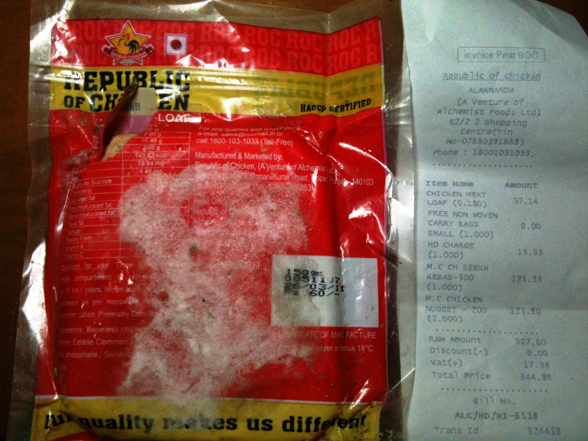 The purpose of my writing this review is that with this experience I have lost all my confidence in ROC having been a loyal customer since the outlet in CR Park, New Delhi opened. After yesterday's shocking incidence I doubt if I will ever buy from ROC again. I mean, I cannot think of feeding my family stale and spoiled chicken as you they are selling.