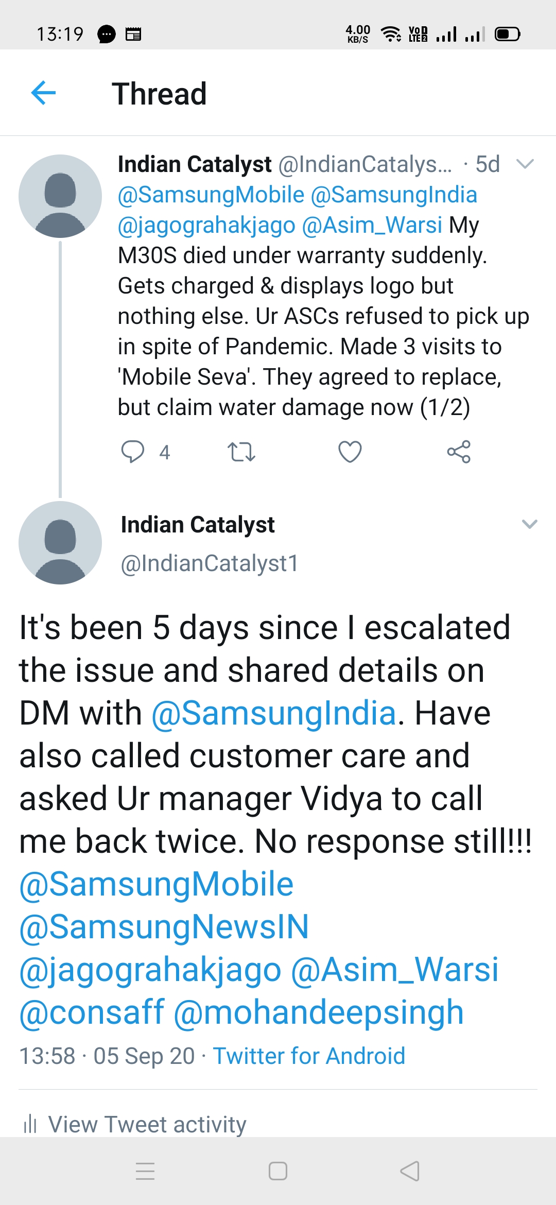 28.My husband requested Mr.Kaushik that if Samsung is not willing to honor the warranty, then they should return the phone in the same condition in which it was given to them(full-on charge and Logo screen being displayed). They have not yet reverted to that.