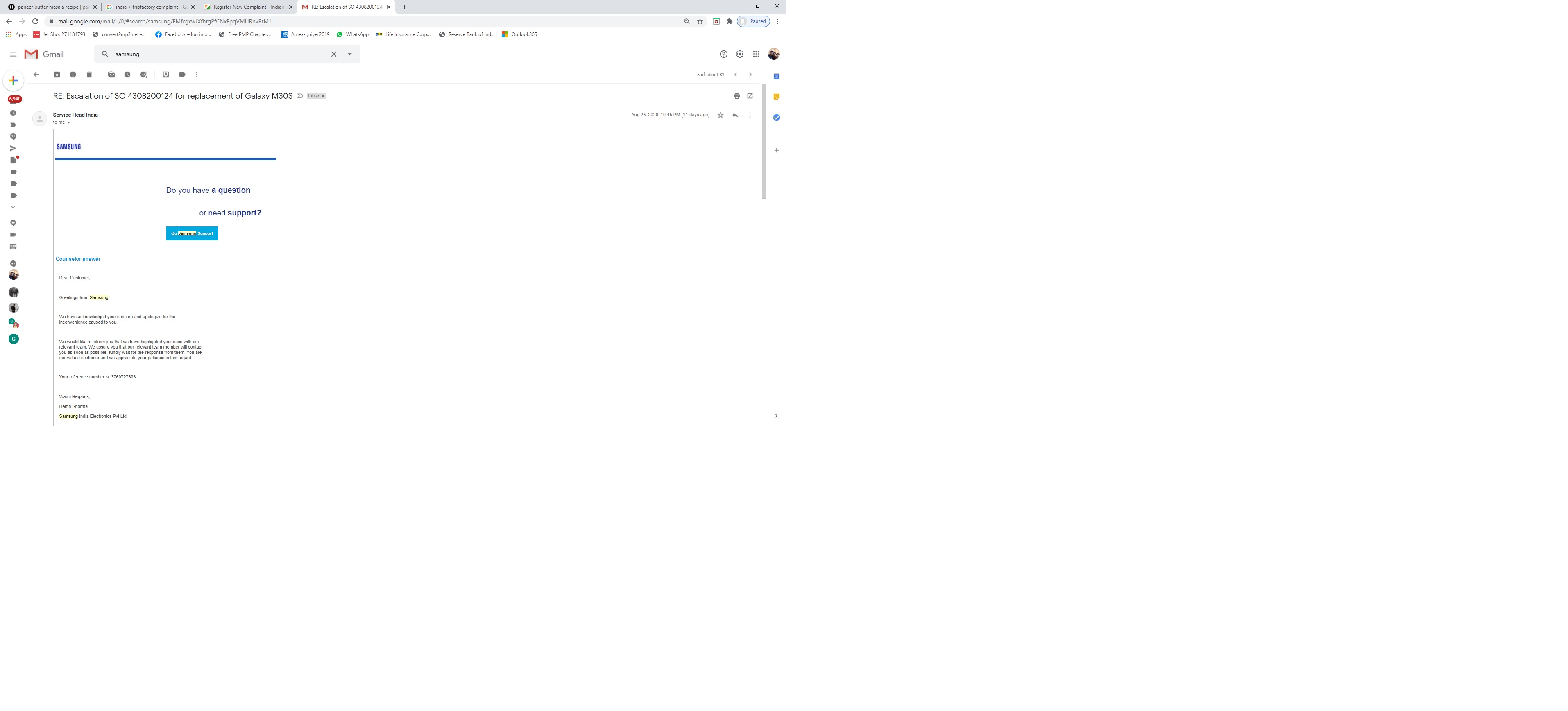 19.My husband got frustrated with the attitude of the ASC and escalated to the Service head, vide SO 4308200124, and reference number 3760727603.