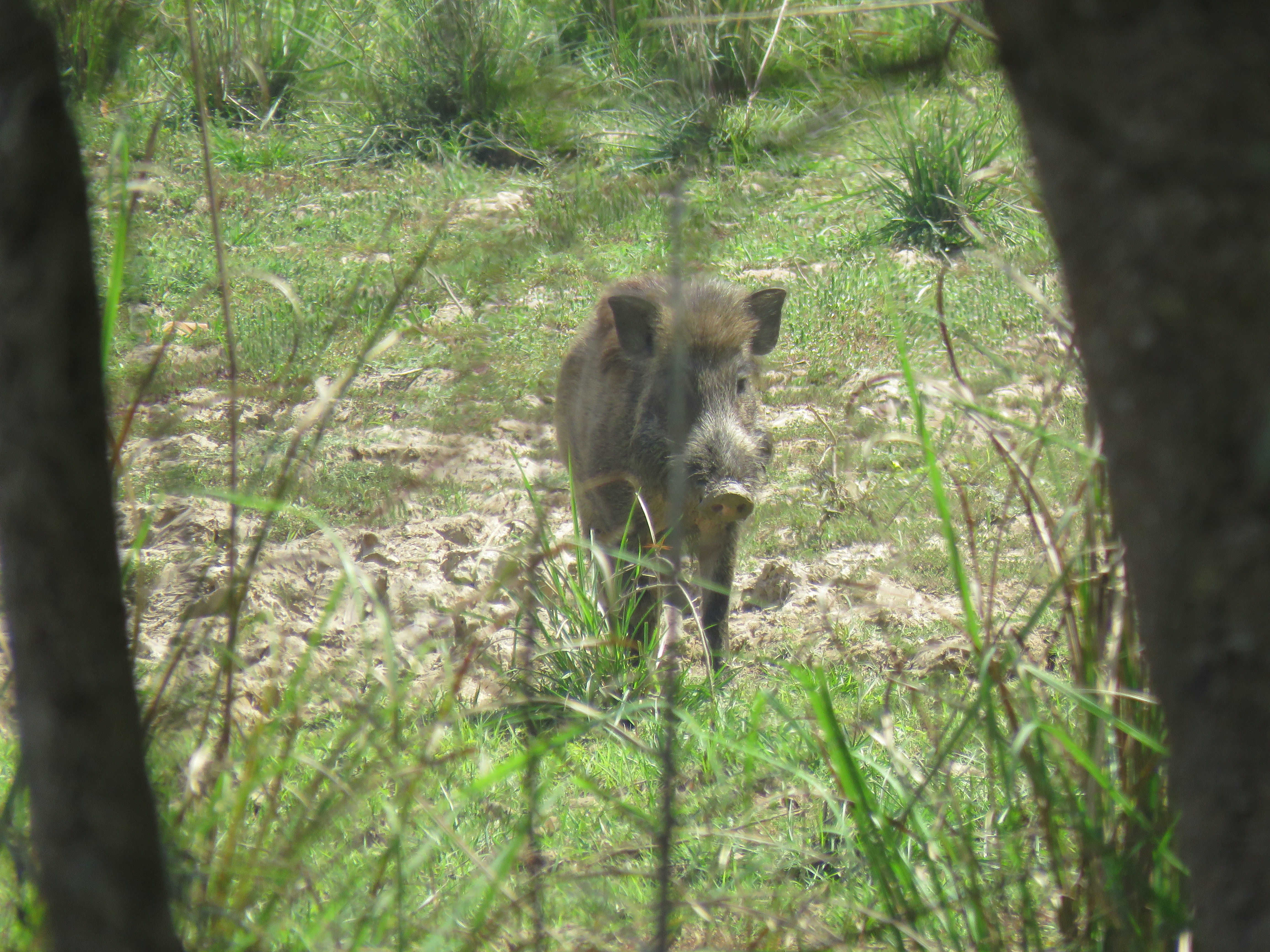Going further, it had become late morning and we came across several birds and wild boar. A stork billed Kingfisher and a Great Slaty Woodpecker were also among those spotted. Not very common sightings at all. We stopped at a pond. This was one of the known sites for crocodiles and rhinos. But there were none here today. A black jackaw and a cormorant greeted us. We could also see a white egret or a heron in the distance. After waiting awhile, we moved on.