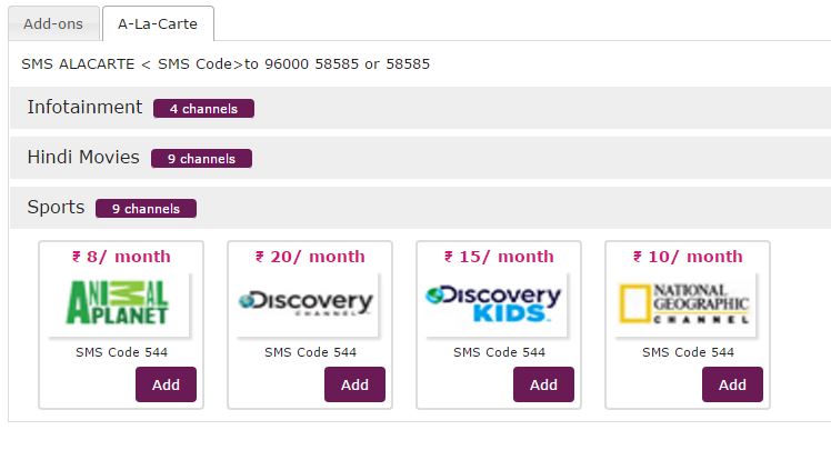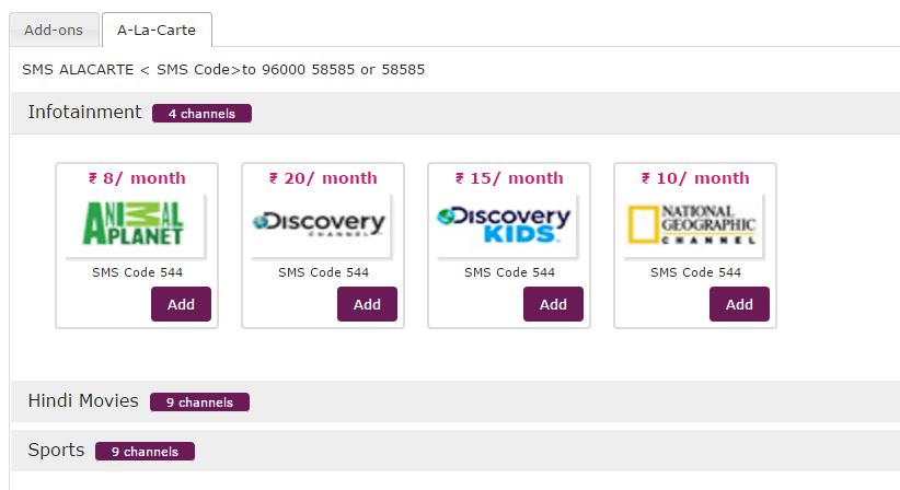 - Poor online support*. https://my.sundirect.in/recharge.aspx# this site is pretty basic. Please refer to the pictures uploaded. Sports or Infotainment has the same options only. Cannot recharge for A-la-carte selections. The process require me to recharge for a random amount and later call them to deduct the A-La-Carte fees from that.
