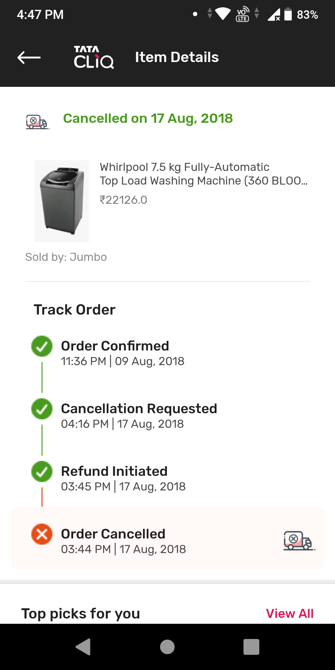 I have purchased a washing machine from TATA CLIQ (online), but after a few days from the date of purchase (9/8/2018) the order was cancelled from your end.