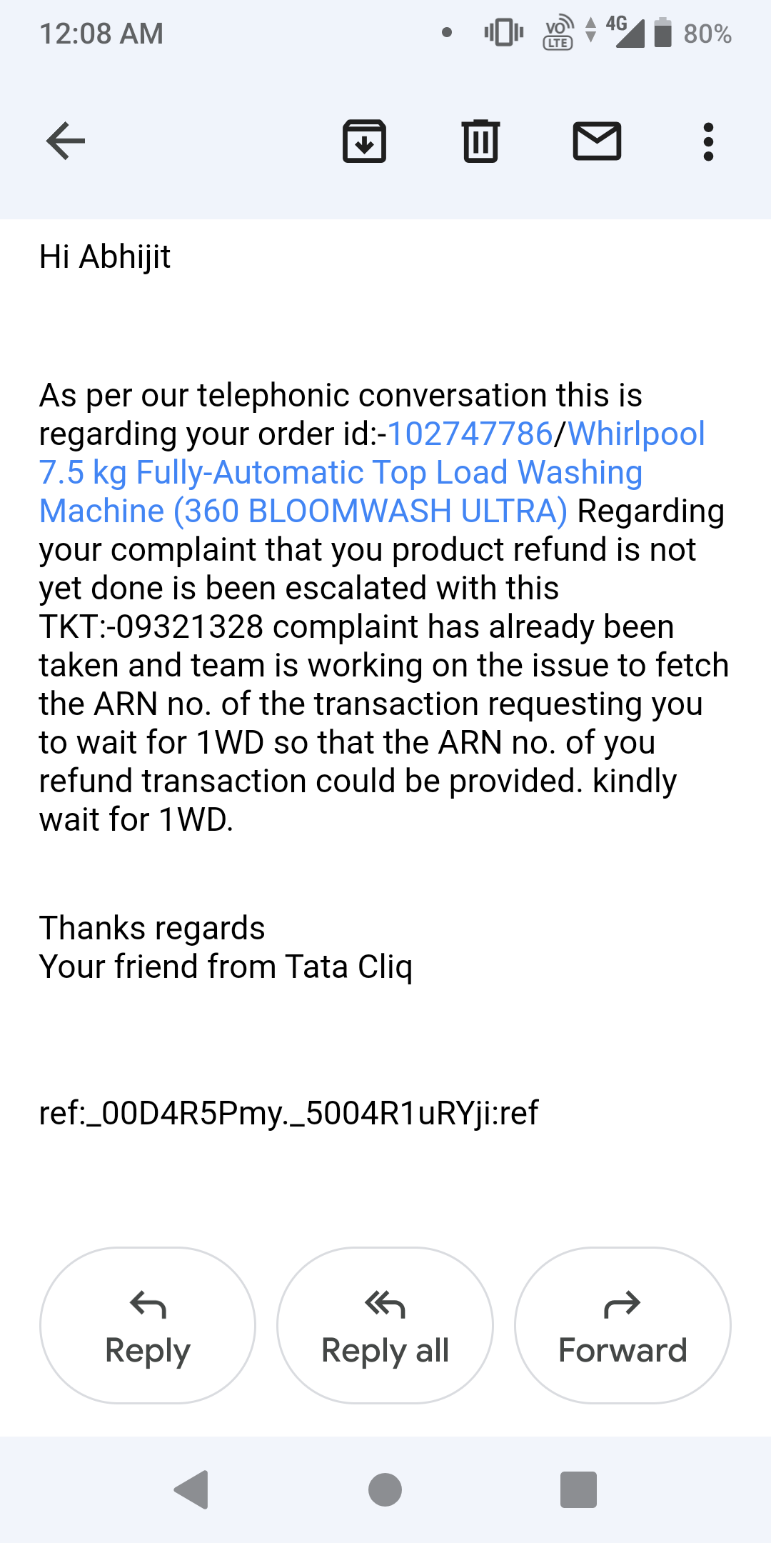 Since then I have been following up sometimes with the bank & sometimes with TATA CLIQ. I have followed up in the year 2018 and then many many times in 2019 but I didn't receive much help. TATA CLIQ representatives kept me waiting for 3 days and they never intimate anything nor do they send any kind of mail. And when I would call after 3 days, they kept me waiting for another 3 days and so on.