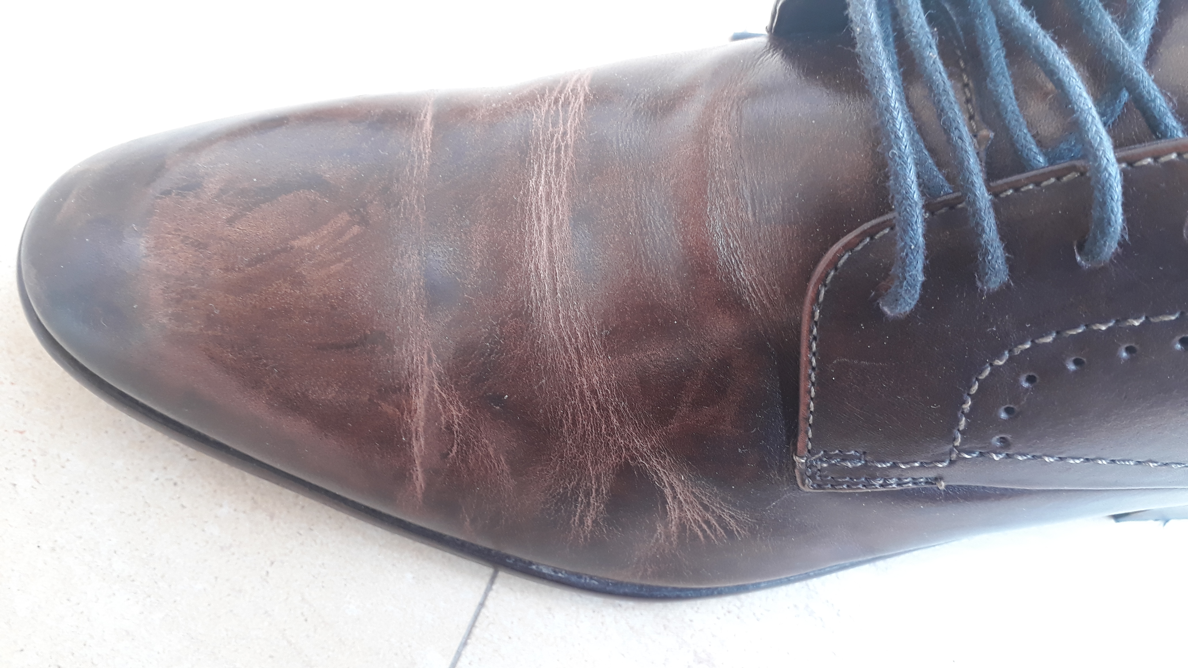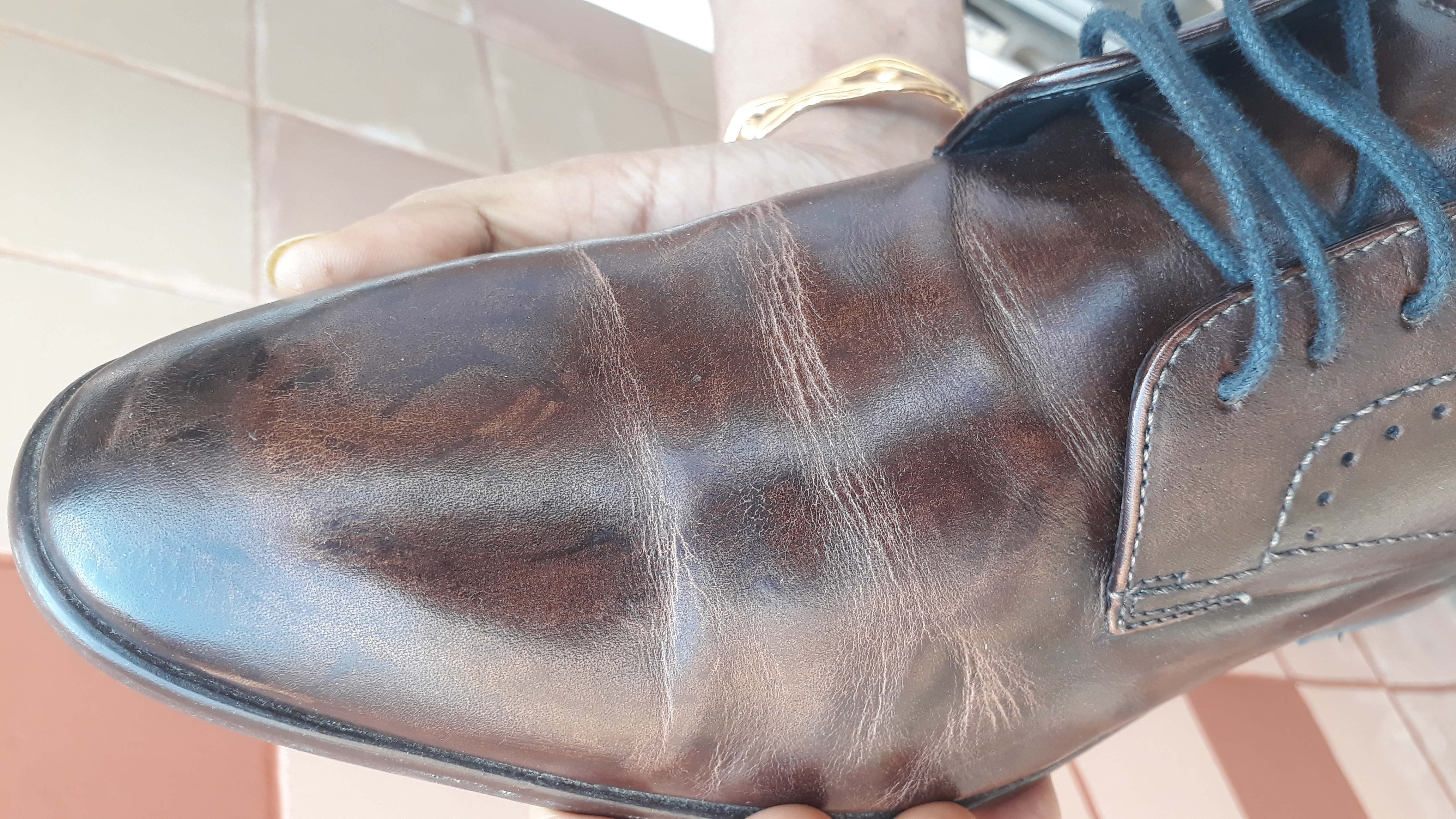 From the first polish itself the brown colour started coming out. It was shocking. Second polish also same result. I reduced the frequency of polishing. Meanwhile just after 3 to 4 times use, there appeared severe and ugly creases on the left pair.